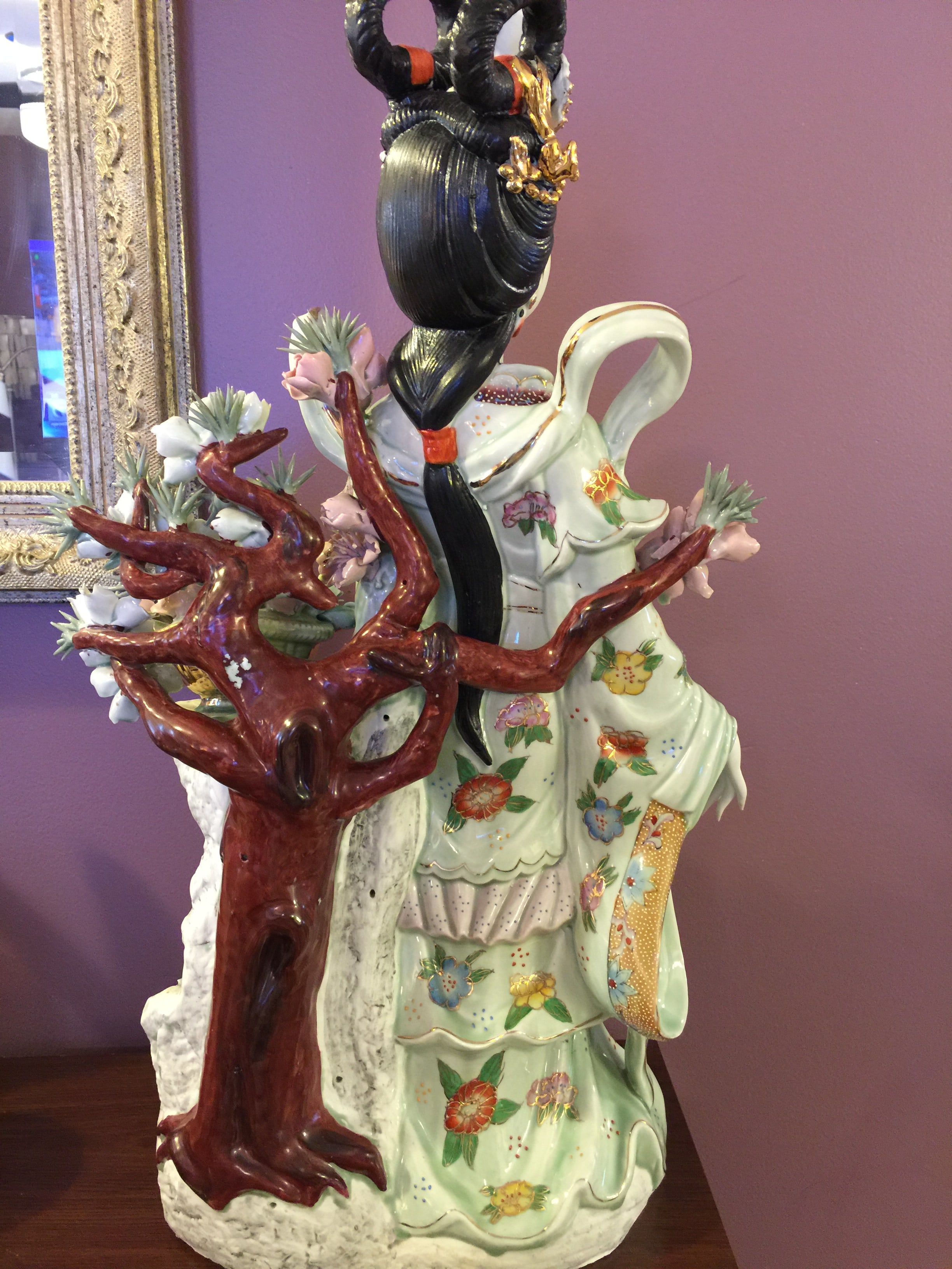 A very nice piece, but actually fairly modern. Most items with made in China stickers tend to date from the 1970's forward. Too bad about the damaged sections of it, that does lower its value considerably. We'd retail one like it for about $250.00