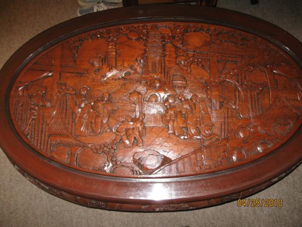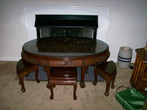 Re: Oriental Hand Carved Oval Coffee Table With 4 Stools