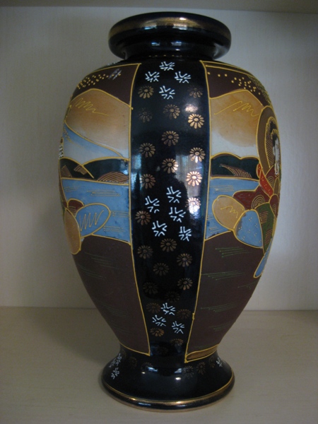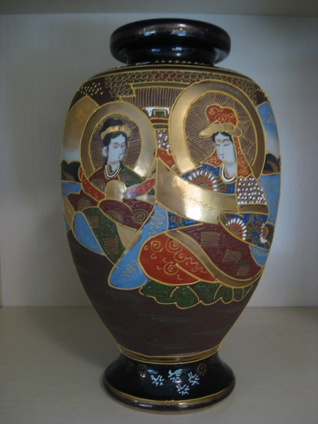 Glazed ceramic vase with painting of a man on one side and 2 women on the other. Paint is textured. Appears hand painted, due to variations. Gold accents have some wear.