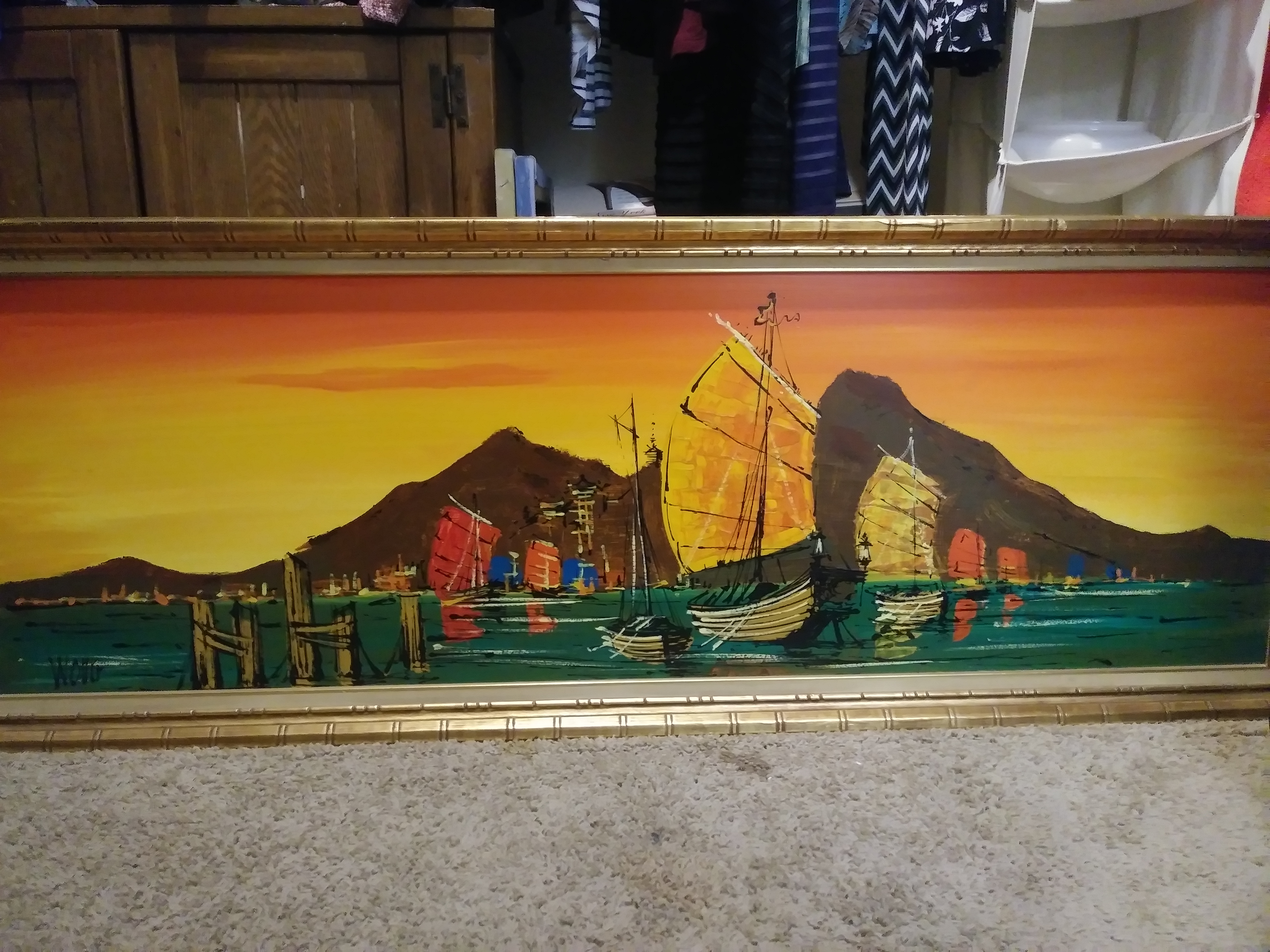 It's painted on a wood type material like a cardboard and framed and the brown paper is still on the back with the Windsor Industries sticker.