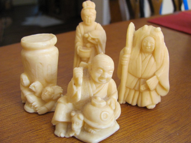 Probably the 1972 Winter Olympics in Sapporo. First thing you can do is make sure they are real ivory. Take a needle and heat it with fire till its really hot, stick it in the bottom of the item. If it melts the item then its some sort of resin or plastic. If not then it is bone or ivory. Also, selling ivory and/or importing it has some laws attached. Not sure if its legal to sell it here. :)