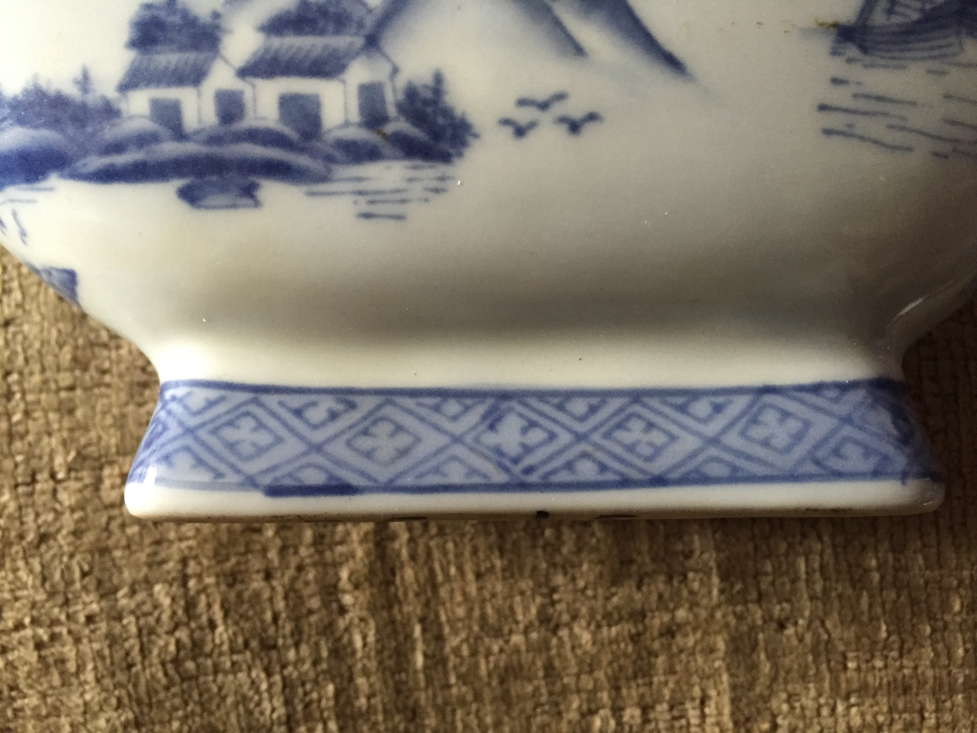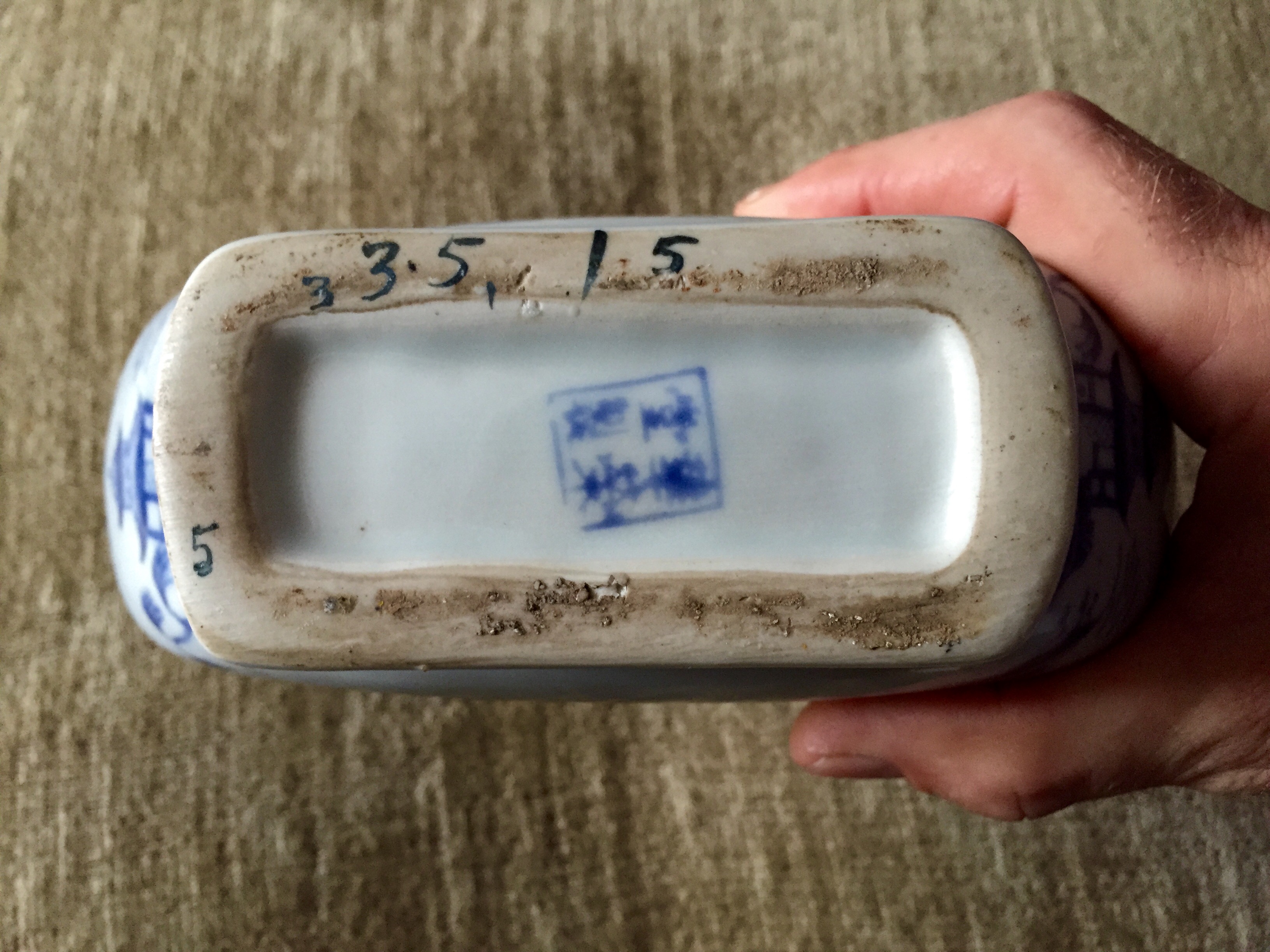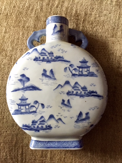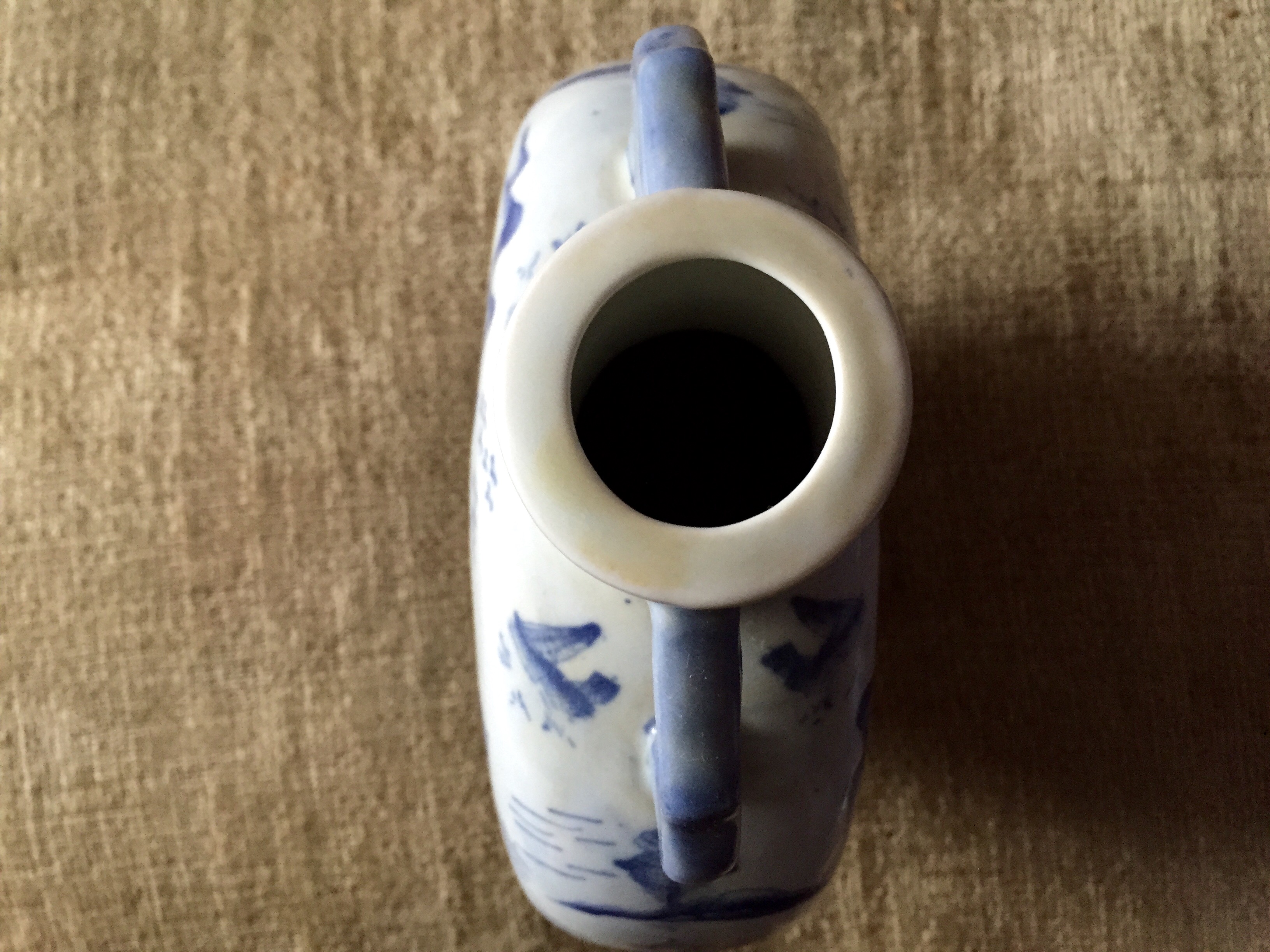 Blue and white oriental moon flask with handwitten number markings on bottom. No chips or cracks. Seems to be hand painted.  Height 260mm x Witdth 200mm x 70mm Depth.  Any information appreciated.