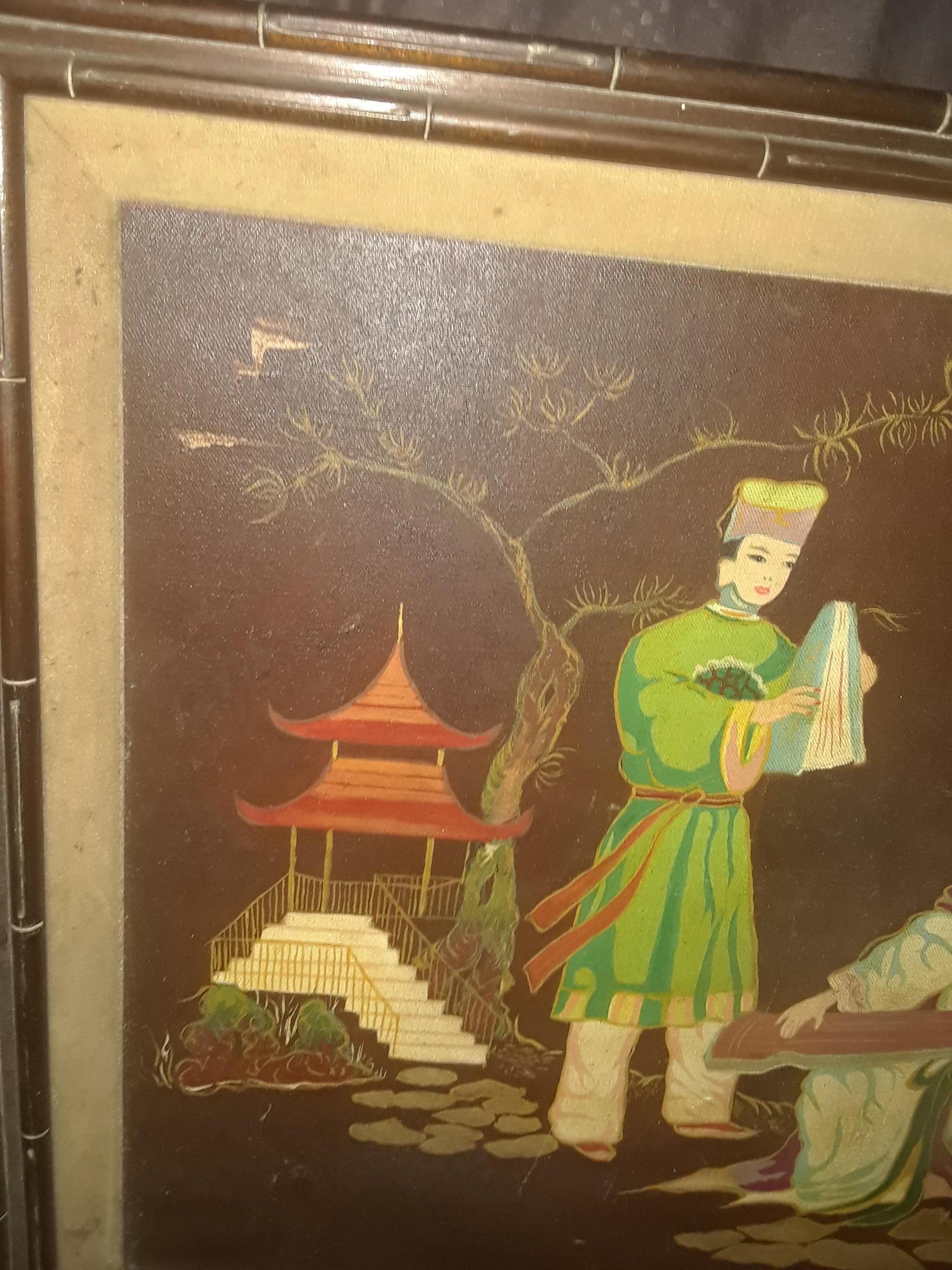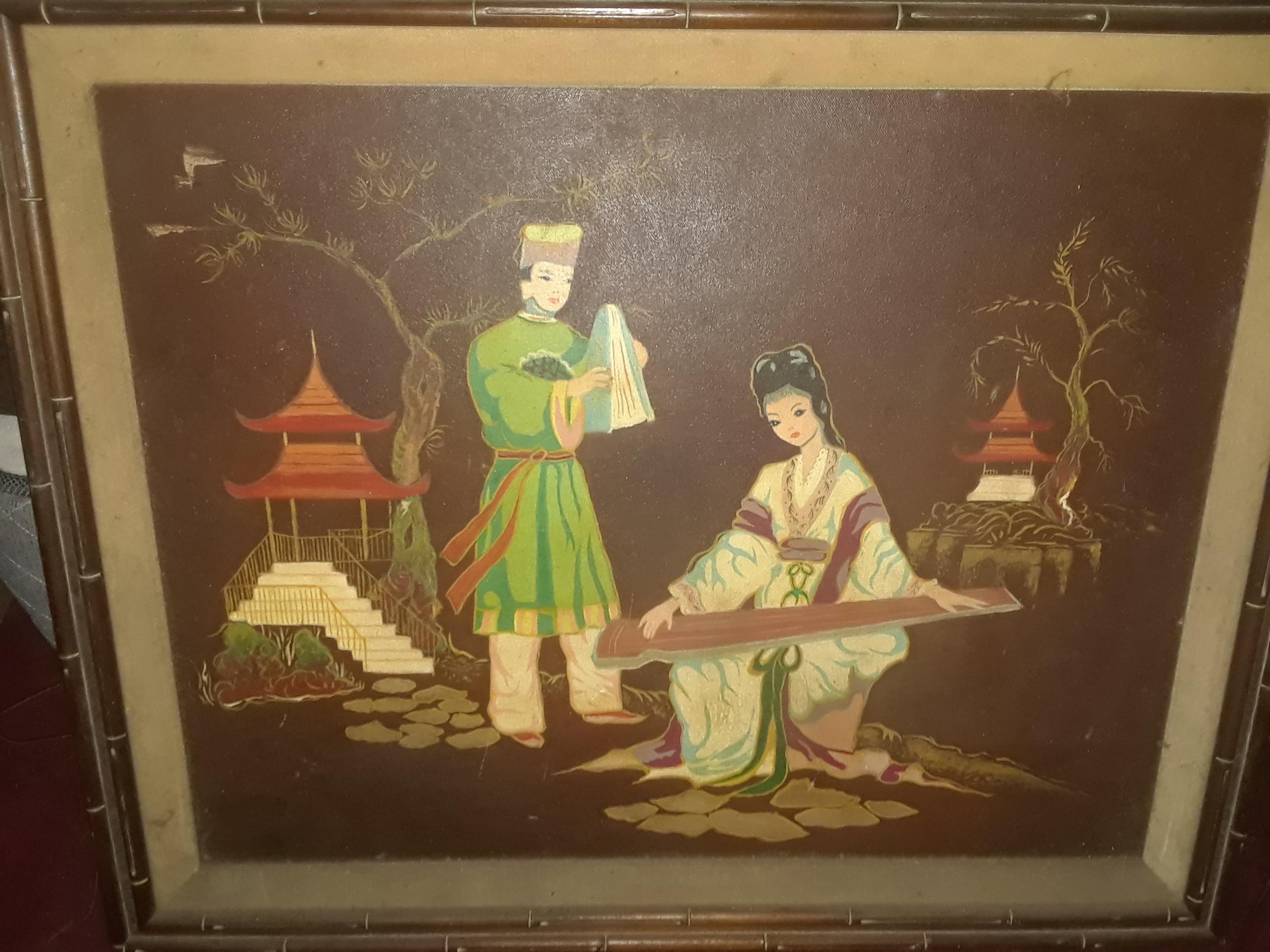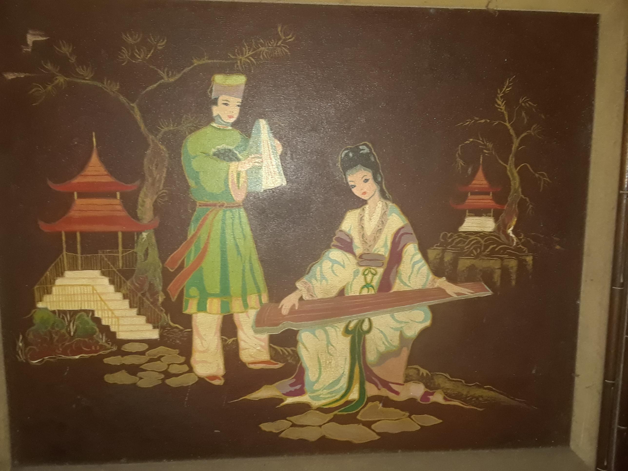 old oriental but i belive asian painting of a man and woman in front of 2 houses and trees brown back ground playing an instrument or hand washing clothes signed k young in wooded frame unique