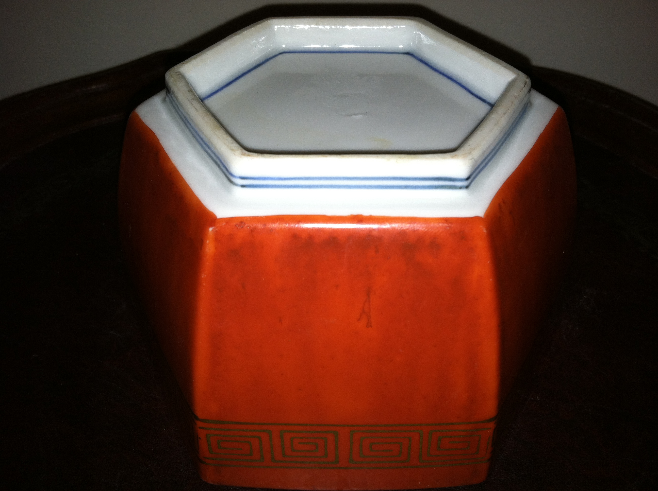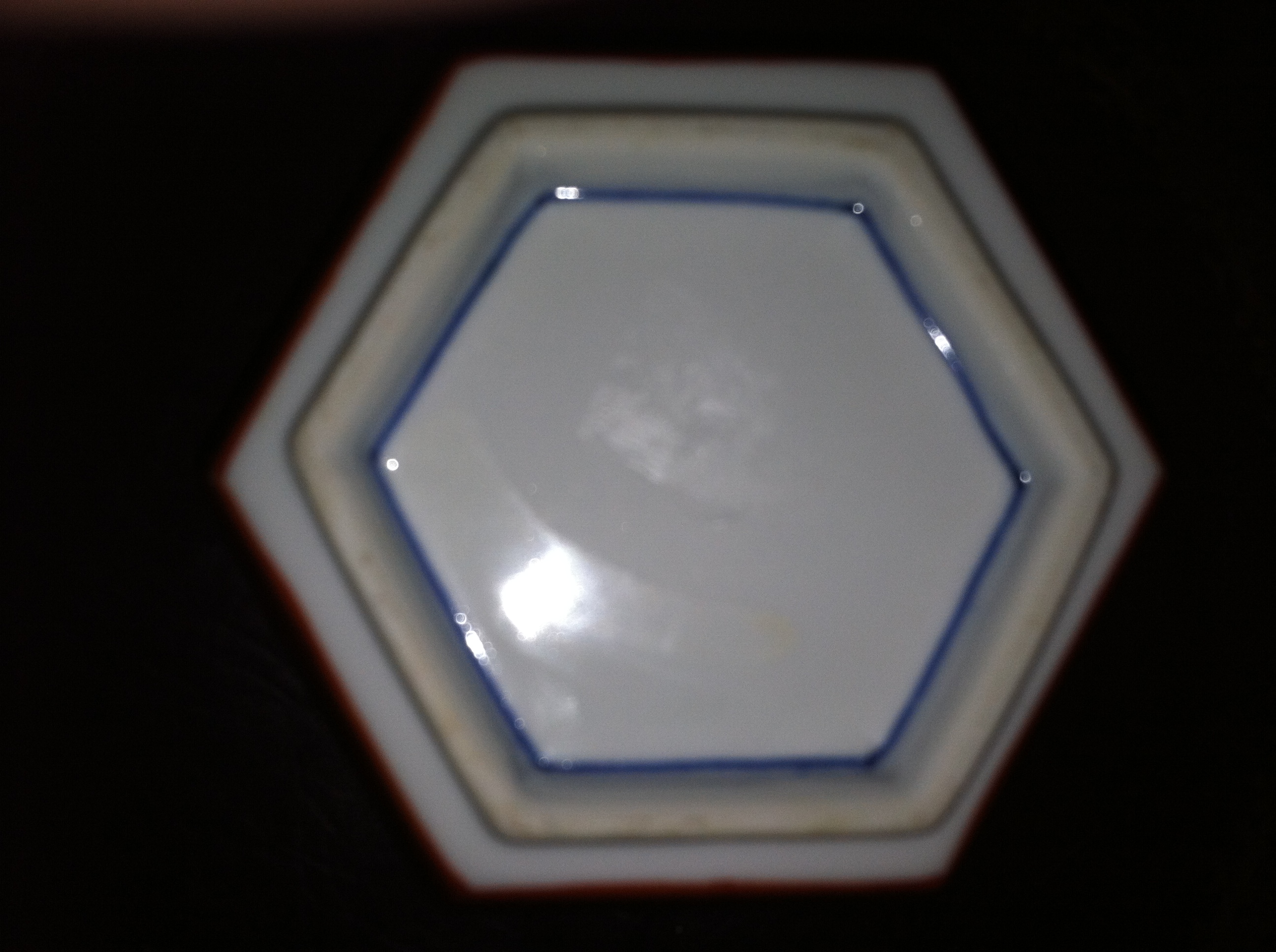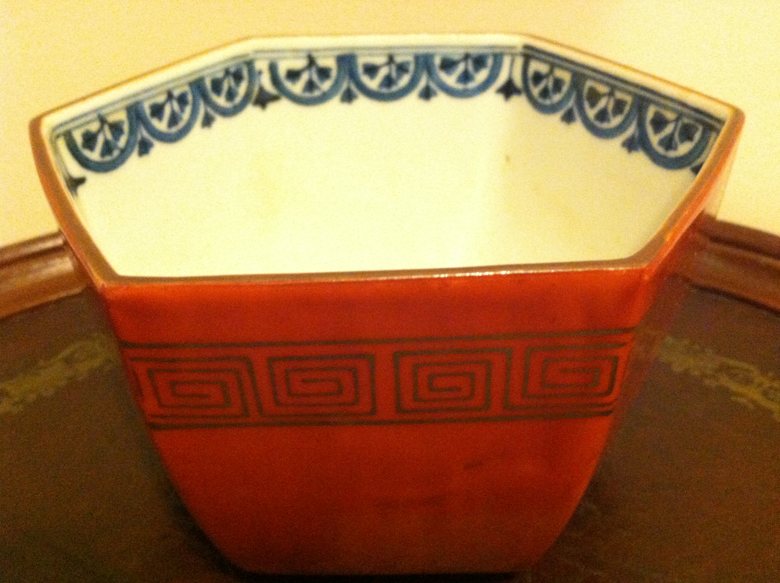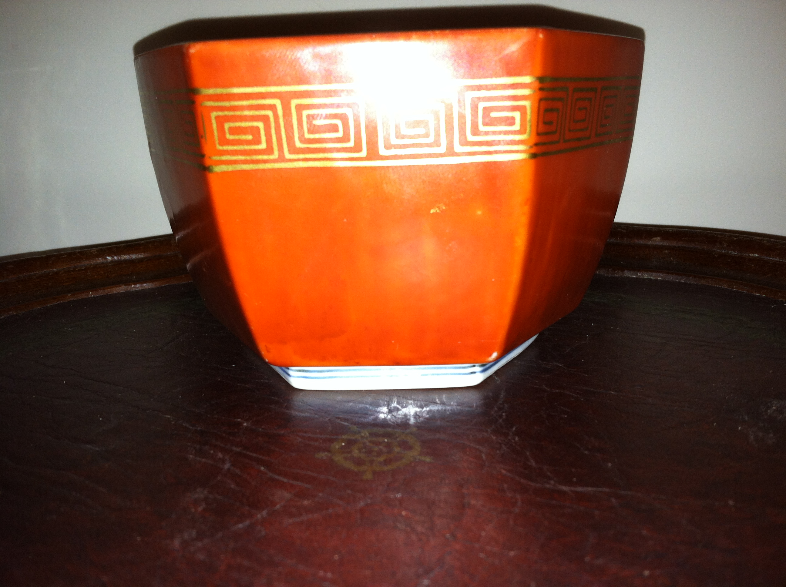 This Beautiful Octagon shape bowl has three colors "Red, Blue and White". It's very rare and collectible and it's looking for a good home. It's H 2" 7/8 x L 4" 7/8....
