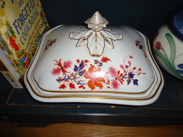 rectangular porcelain oriental serving dish with gold trim, it has what looks like a number 3 on the inside of the lid and on the bottom of the dish.