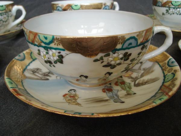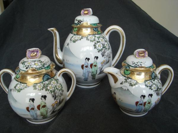 There is a tea pot, sugar and creamer. Six saucers and cups. One cup and two saucers were broke and glued back together. The rest are in perfect condition. The tops of the lids have purple flowers. There is alot of gold on all pieces.