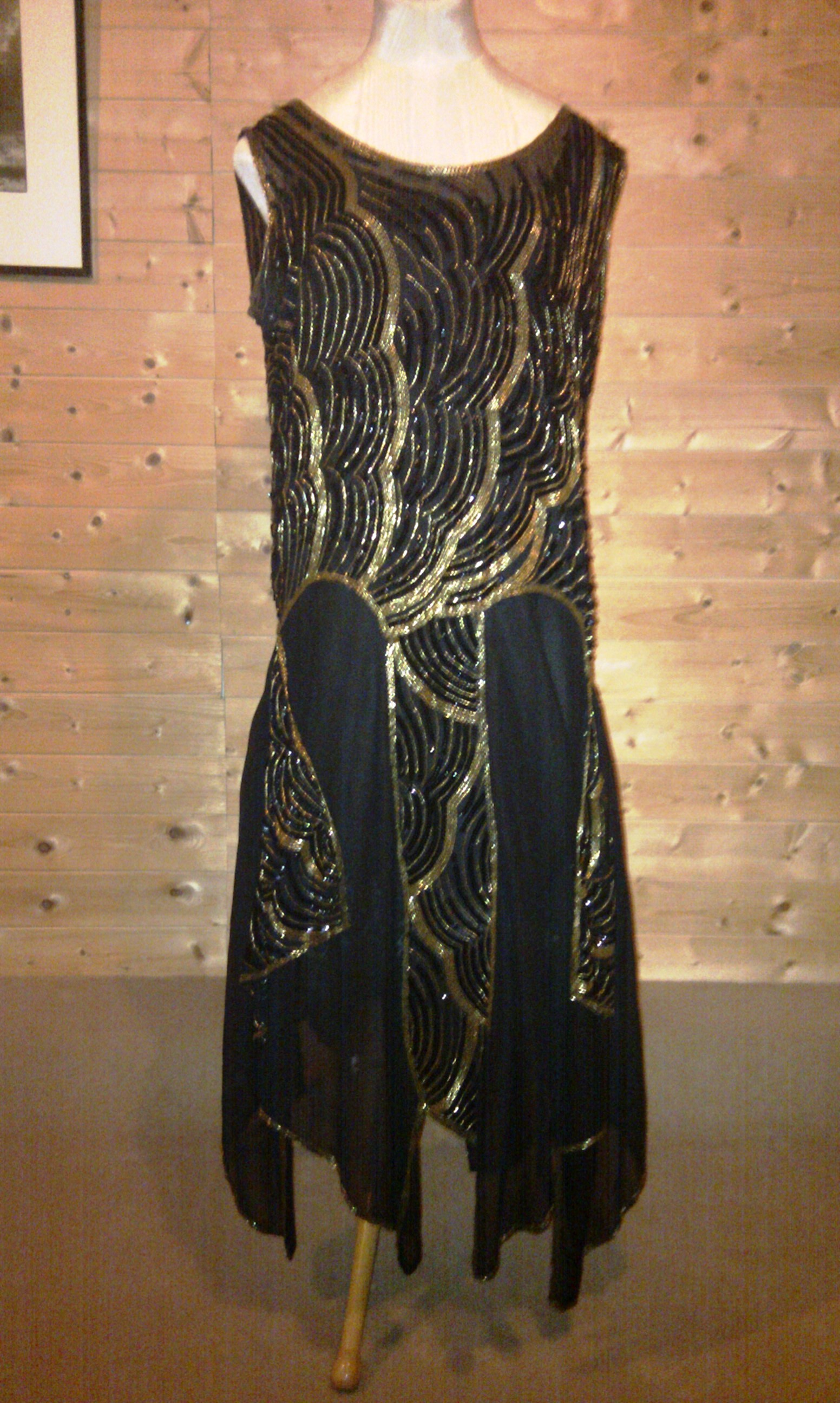 Original 1920's hand made (in the early 1920's) black & gold beaded chiffon handkerchief style dress