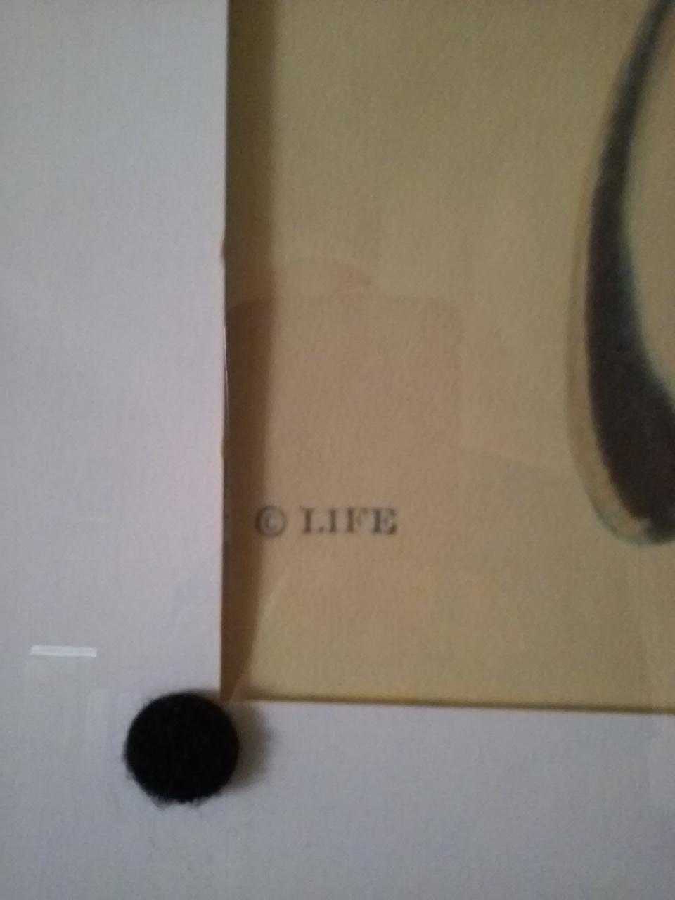 small tear at bottom do to frame was small height so it was bent along bottom edge-crease mark along bottom edge. I have it on this frame to flatten the crease.