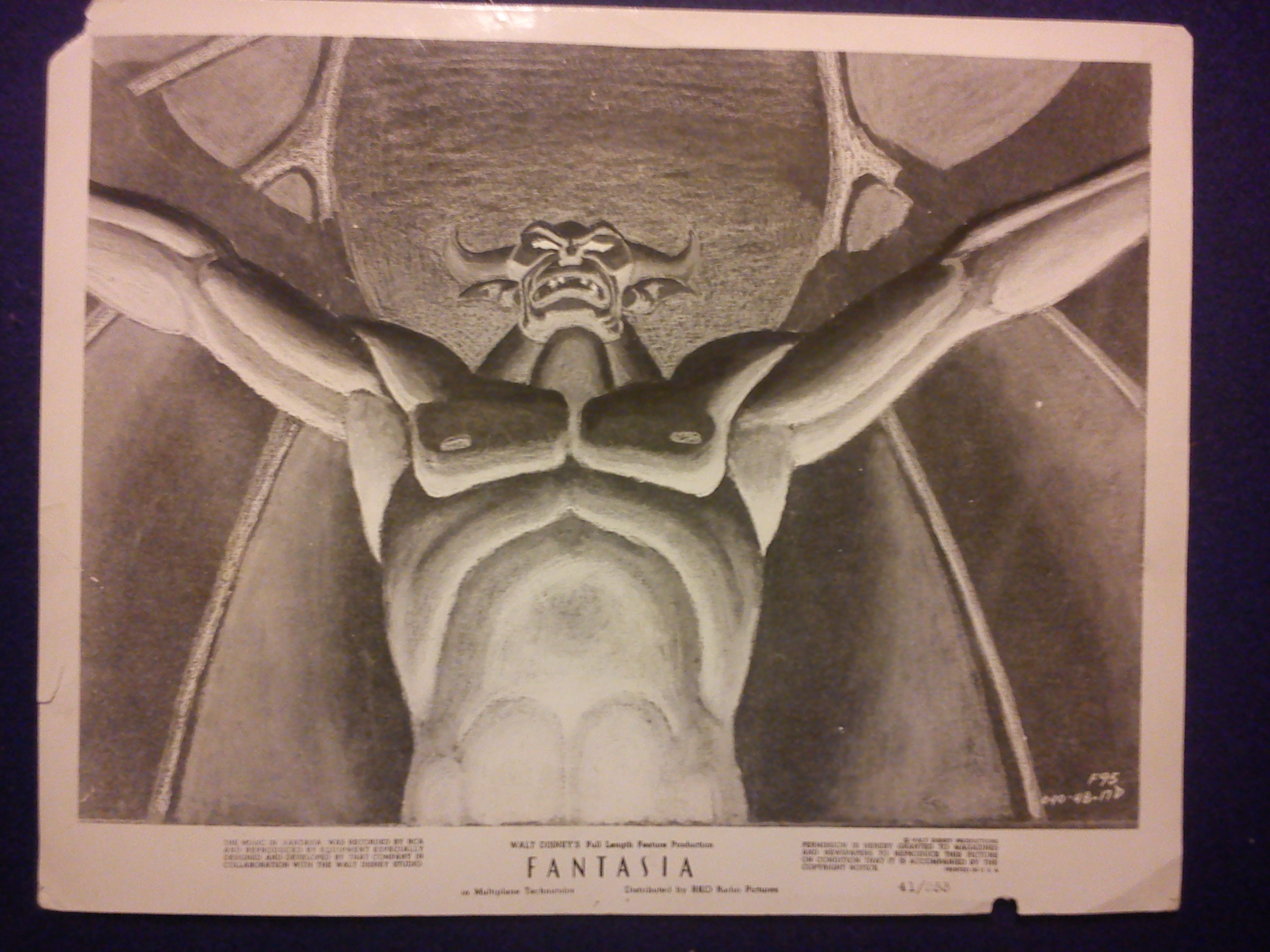 I stumbled across this old print tucked away in a vintage album cover. The print is a black and white drawing of Chernabog from Disney's Fantasia. The print is numbered 41/253 and also has a number stamp: F95 090-48-17D. The picture has a white border and on the white border at the bottom the text includes: