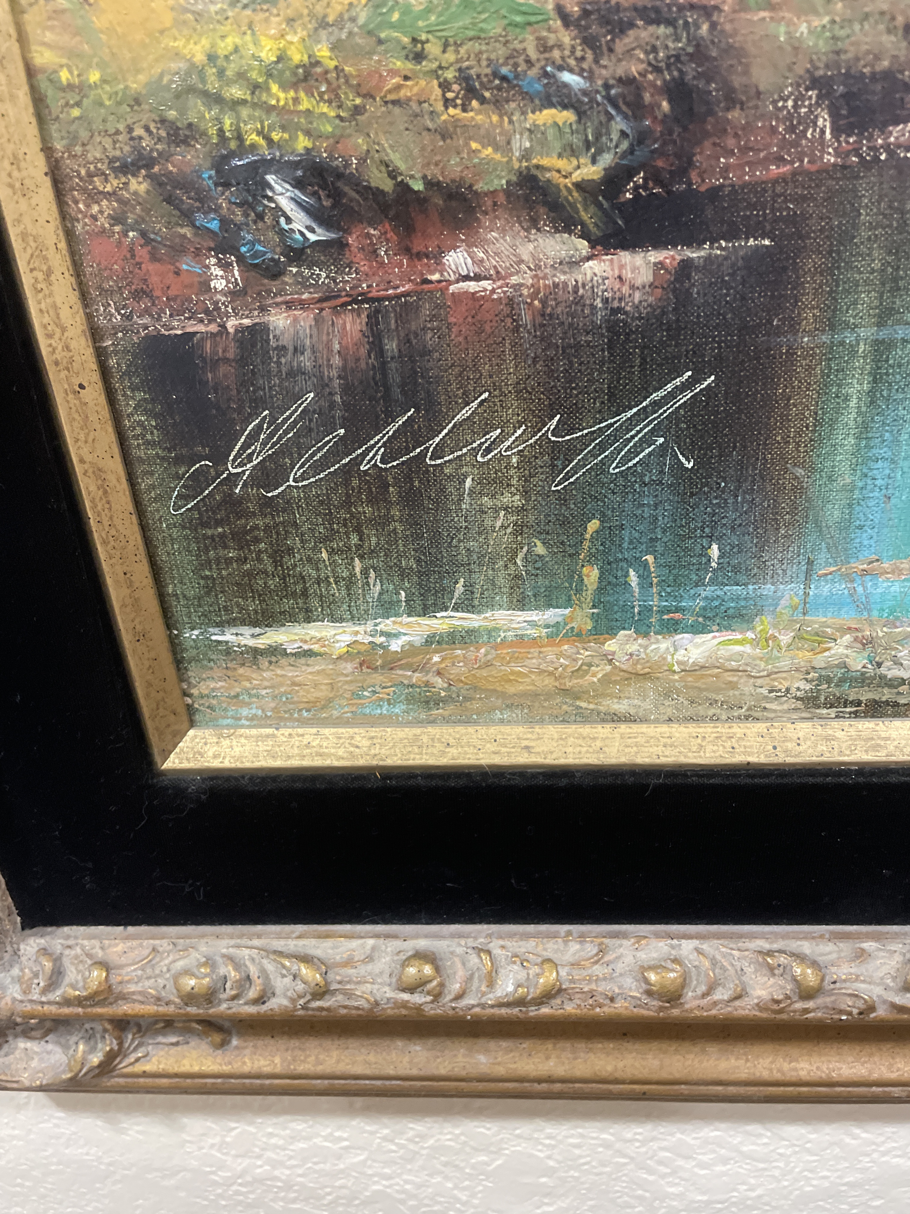 Original Oil Painting by A. Schlueter. Made by A. Schlueter. Dating to Circa 1970. Materials: Oil on canvas, ornate wooden frame. Estimated value: $200 – $400. Condition: Excellent. The market for original oil paintings, particularly landscapes, is currently moderate, with a steady demand for quality pieces. Prices have shown some fluctuation but remain stable overall.