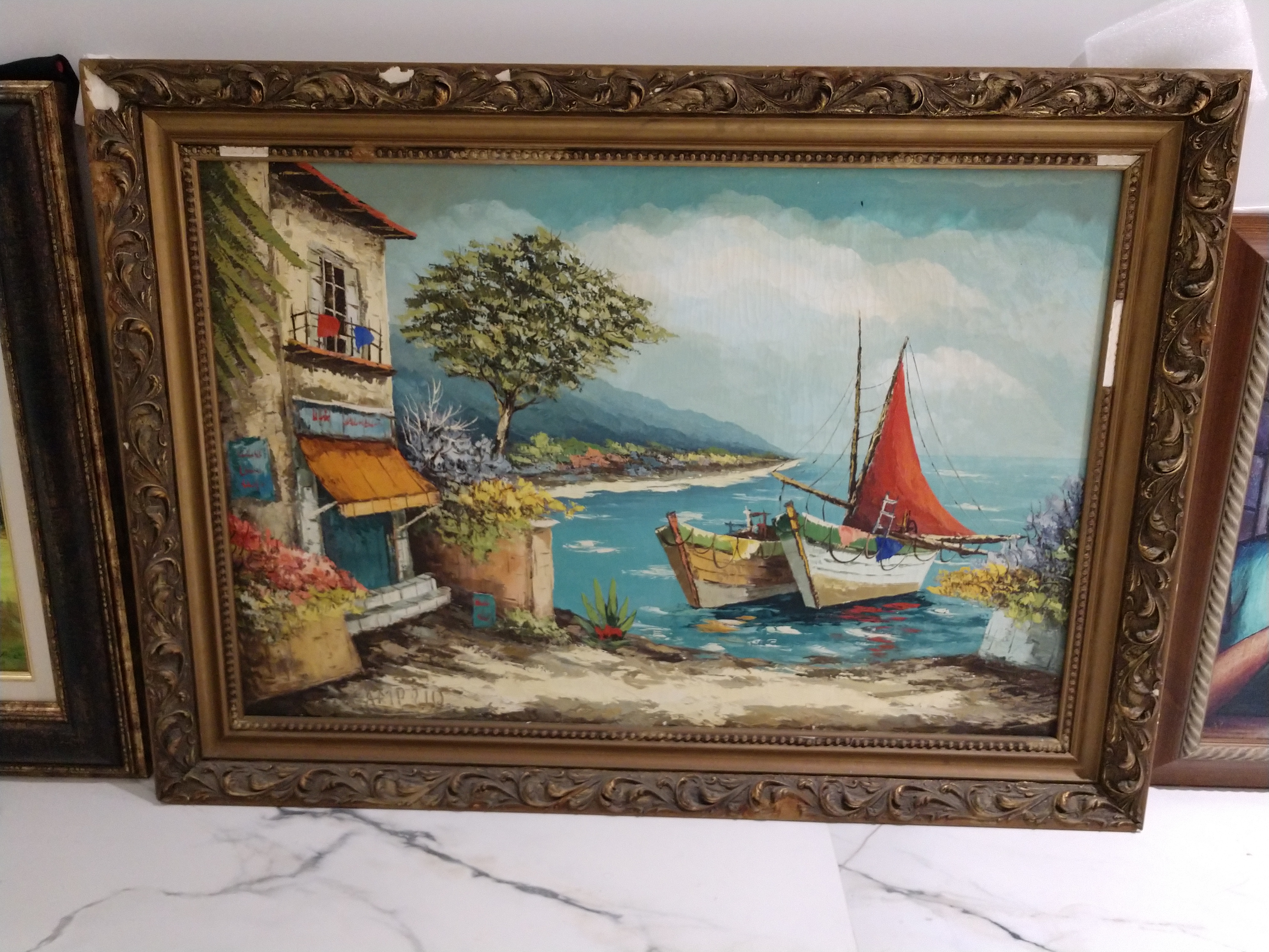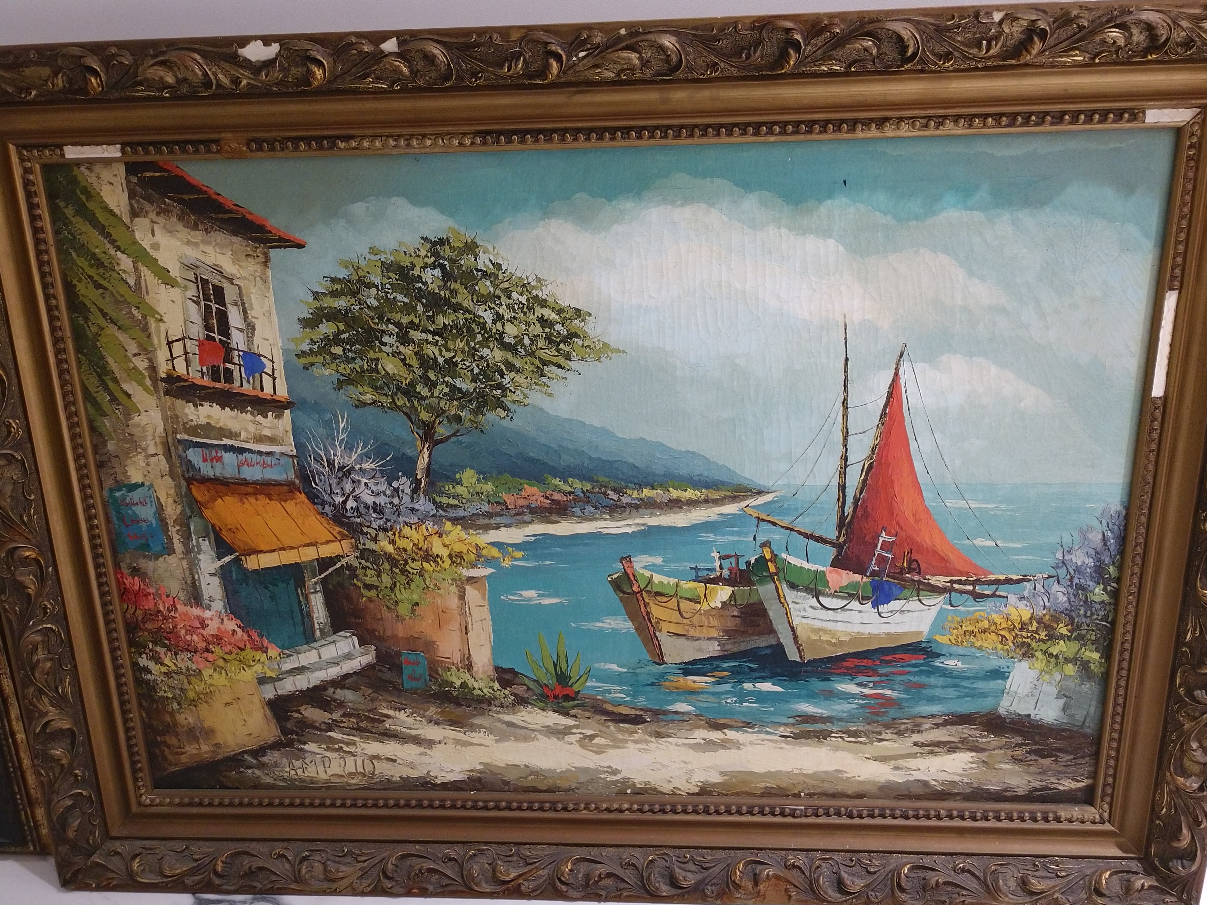 His canvasses are vibrant with color showing off his skills that have made his art sought after in recent years. Hand carved, gold highlighted wood frame. Wood frame is in bad shape.