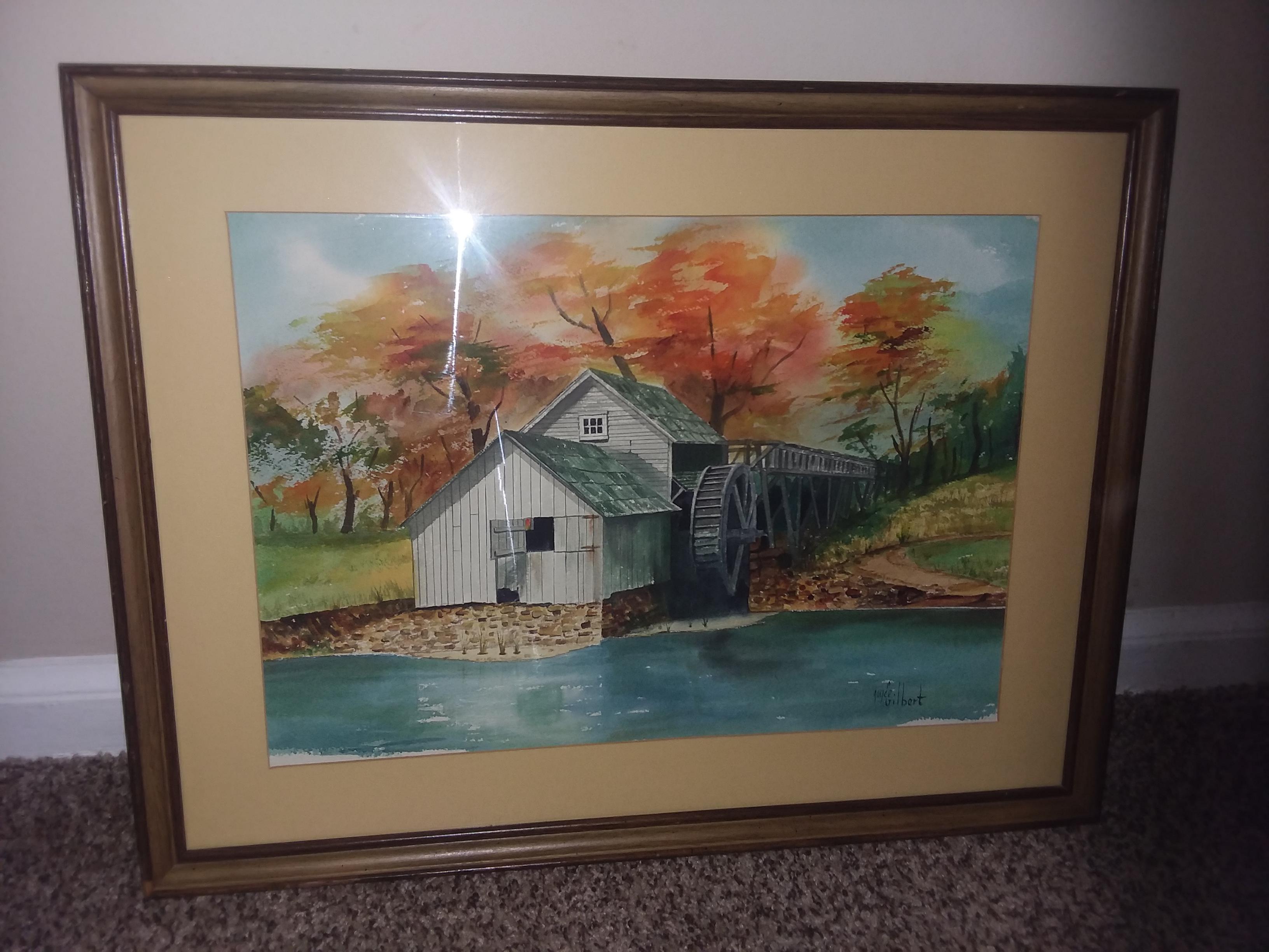 Original signed by artist Joyce Gilbert Watercolor. Looks like an old watermill? A search for this artist turned up another watercolor (The Bullwheel) that sold at an auction for undisclosed amount with no other info on the artist, I know its her work from the signature . My search turned up info on a Joyce Gilbert watercolor artist but I have no way of determining if its the artist of my painting although I think it is. I also found a search of her name as deceased artist but again am unsure if its her.