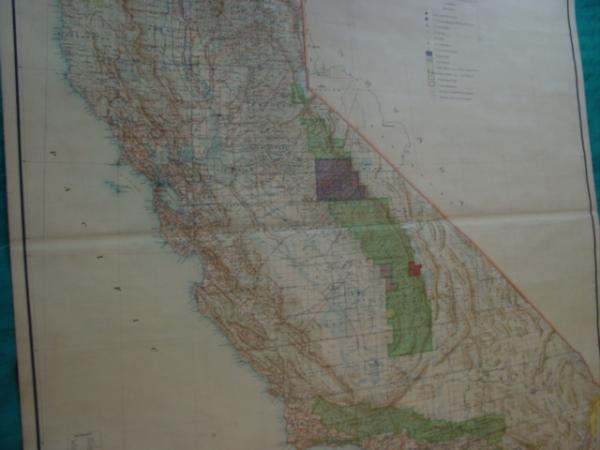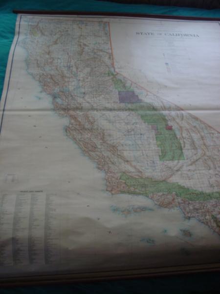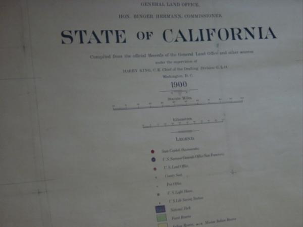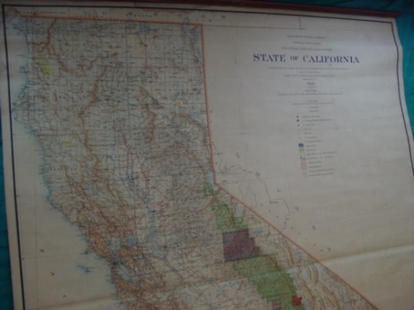 This is a very large wall map of California in 1900 showing public land grants and Indian Territory. This is an official map made by the U.S. government in Wasington Dc, General Land Office. It is in excellent condition with very little browning, a few tiny stains on the top, no tears or mold or any other discoloration . It is very detailed, showing California as it was in 1900. Every creek, every hill, state parks, and even trails. It is apparent that the men who created this map put in a great amount of time and effort.