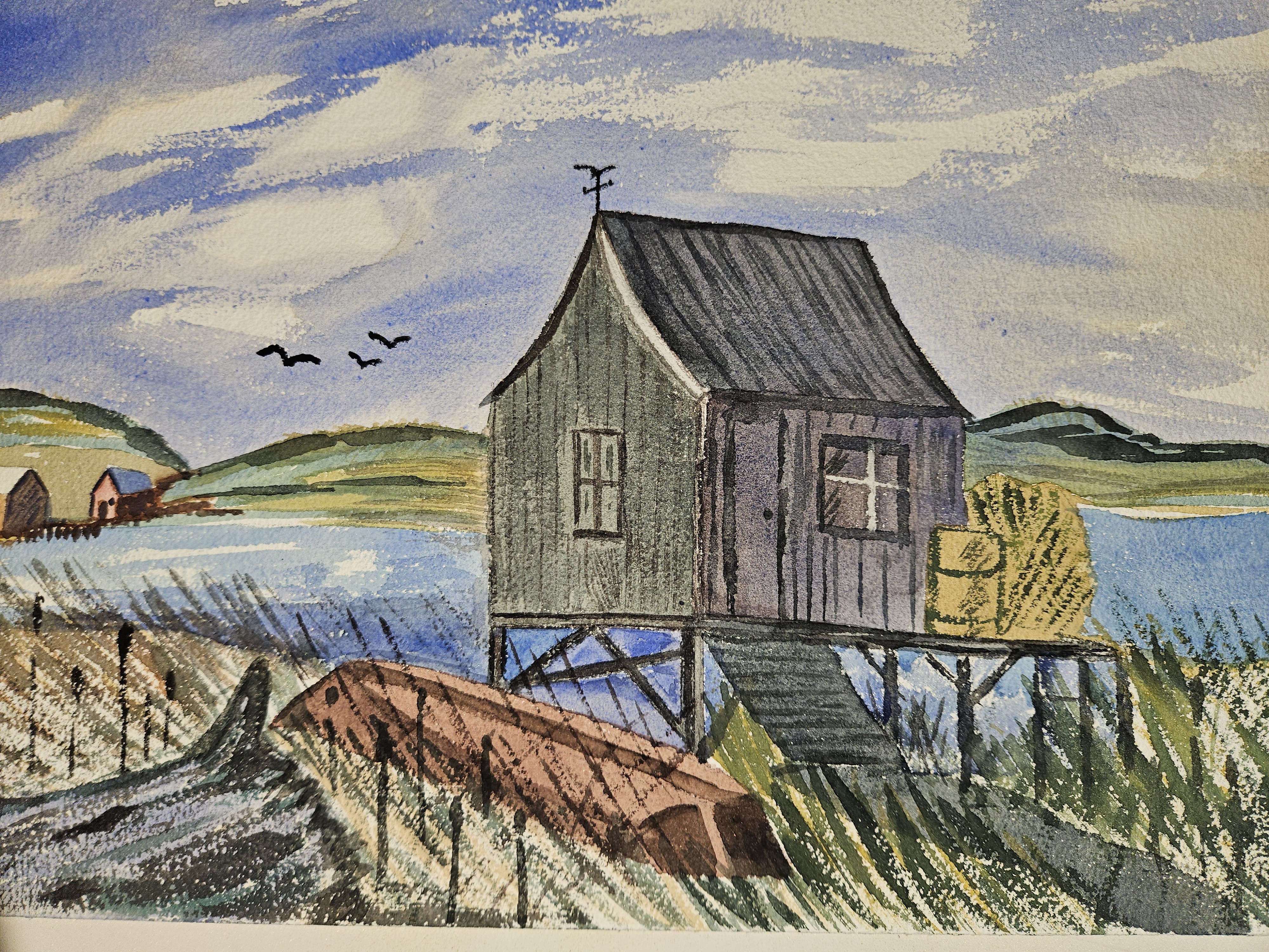 The artist’s signature is partially legible, appearing to be "Shineer" or a variation. No well-documented artist by this exact name is currently recorded in major art databases. However, the style of the paintings aligns with 20th-century American or Canadian regionalist watercolorists, often depicting rural landscapes, cabins, and seasonal scenes. The technique suggests an experienced painter, likely trained in impressionistic or folk art traditions.