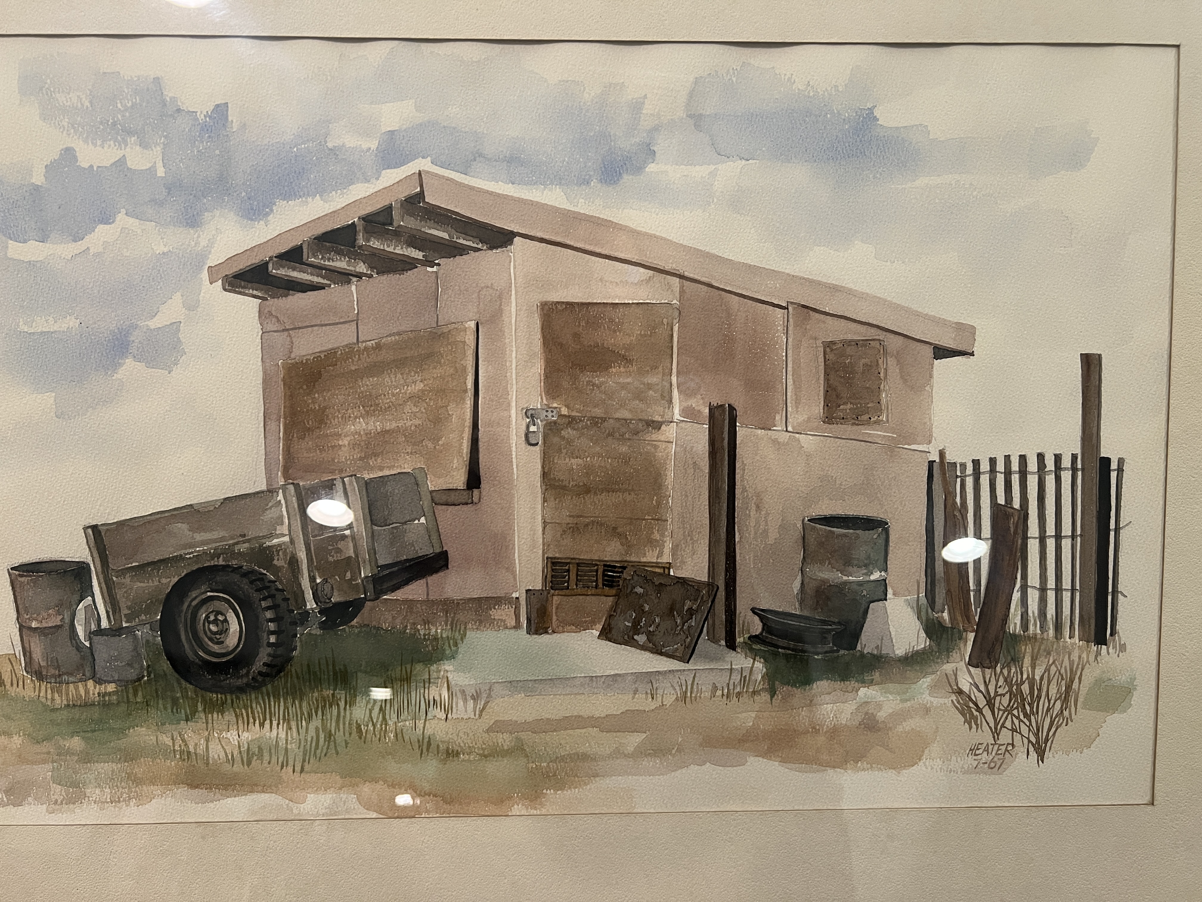 Physical Description: This original watercolor painting, created by W. Heater, is dated July 1967. The artwork is framed and matted, with the frame believed to be made of oak worm wood. The overall dimensions of the framed piece are 29 1/2” x 22 1/2”, while the image itself measures 20 1/2” x 13”. The painting depicts a rustic scene featuring a small building, a trailer, and various objects, rendered in soft watercolors.
