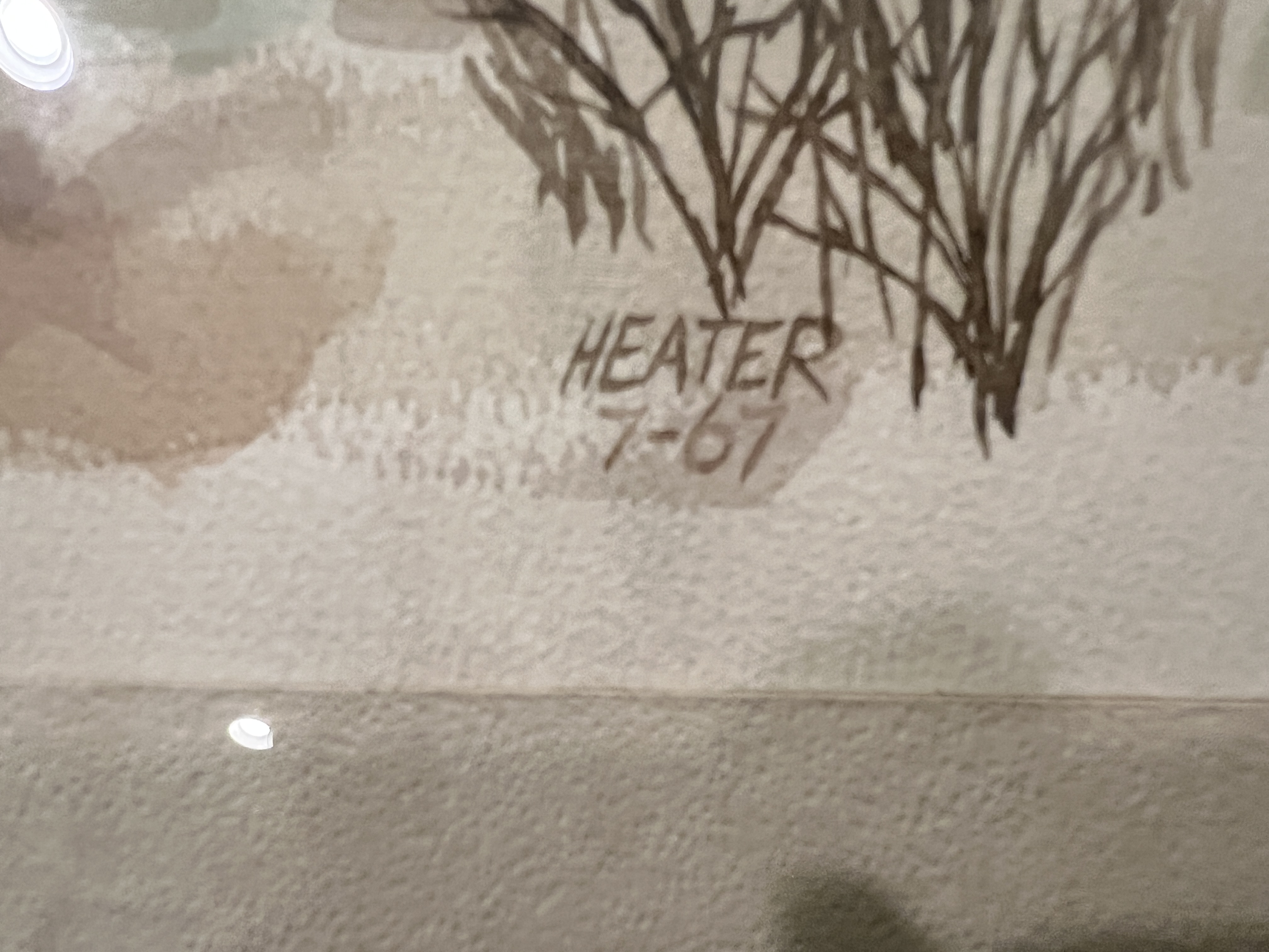 A signed watercolor by W. Heater, dated 7-67. Framed and matted. Frame is believed to be oak worm wood.
