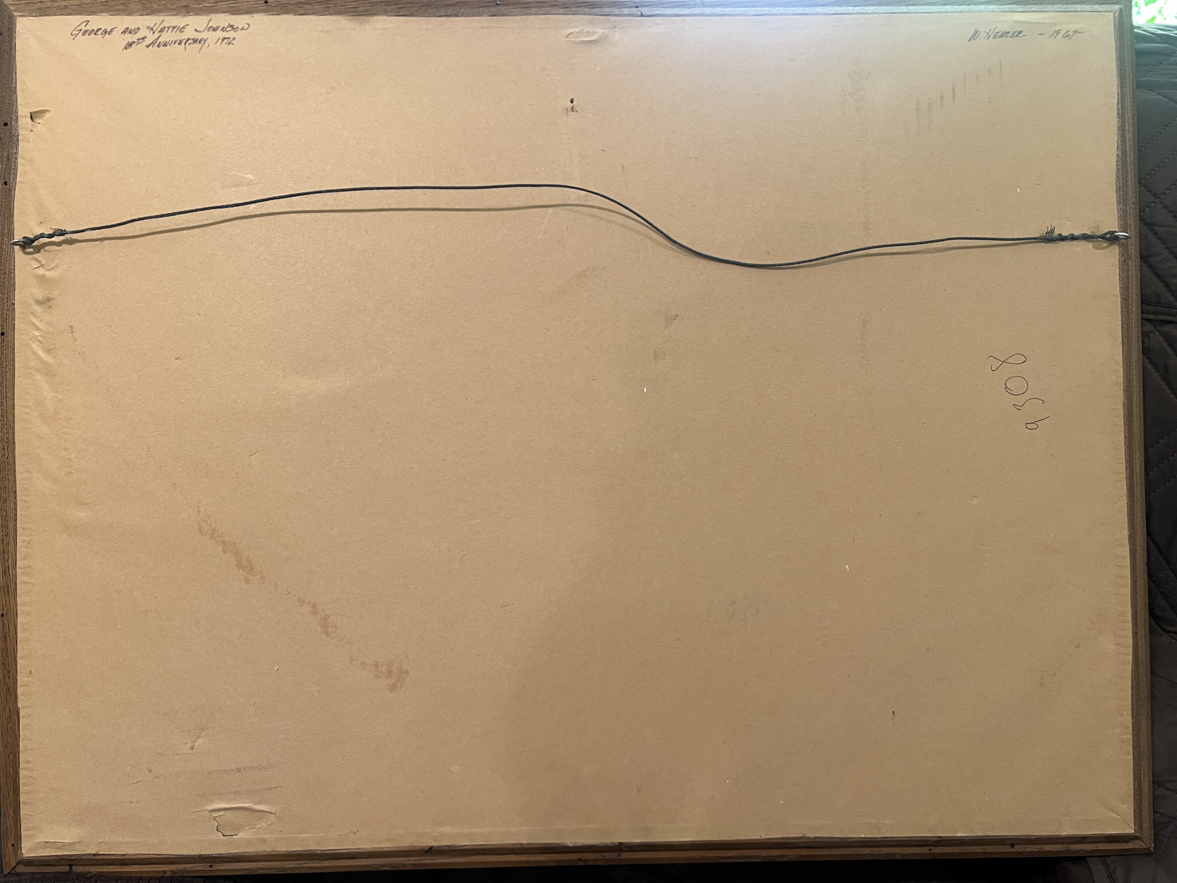 Condition Assessment: The artwork appears to be in good condition, with no visible tears or significant fading. However, the frame exhibits minor wear consistent with age, including some scratches and small dents. The matting is intact, and there are no signs of moisture damage. The back of the frame shows some discoloration, which is typical for pieces of this age.
