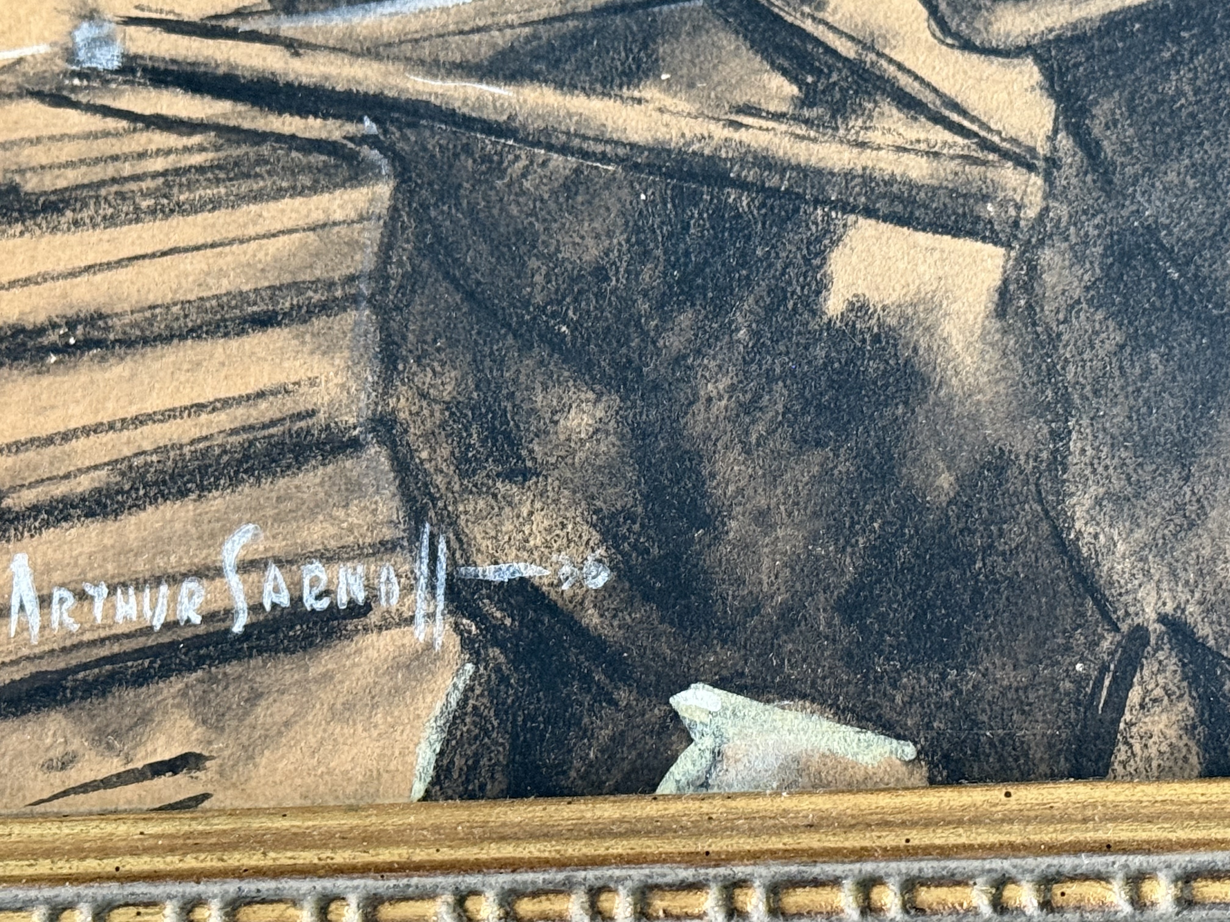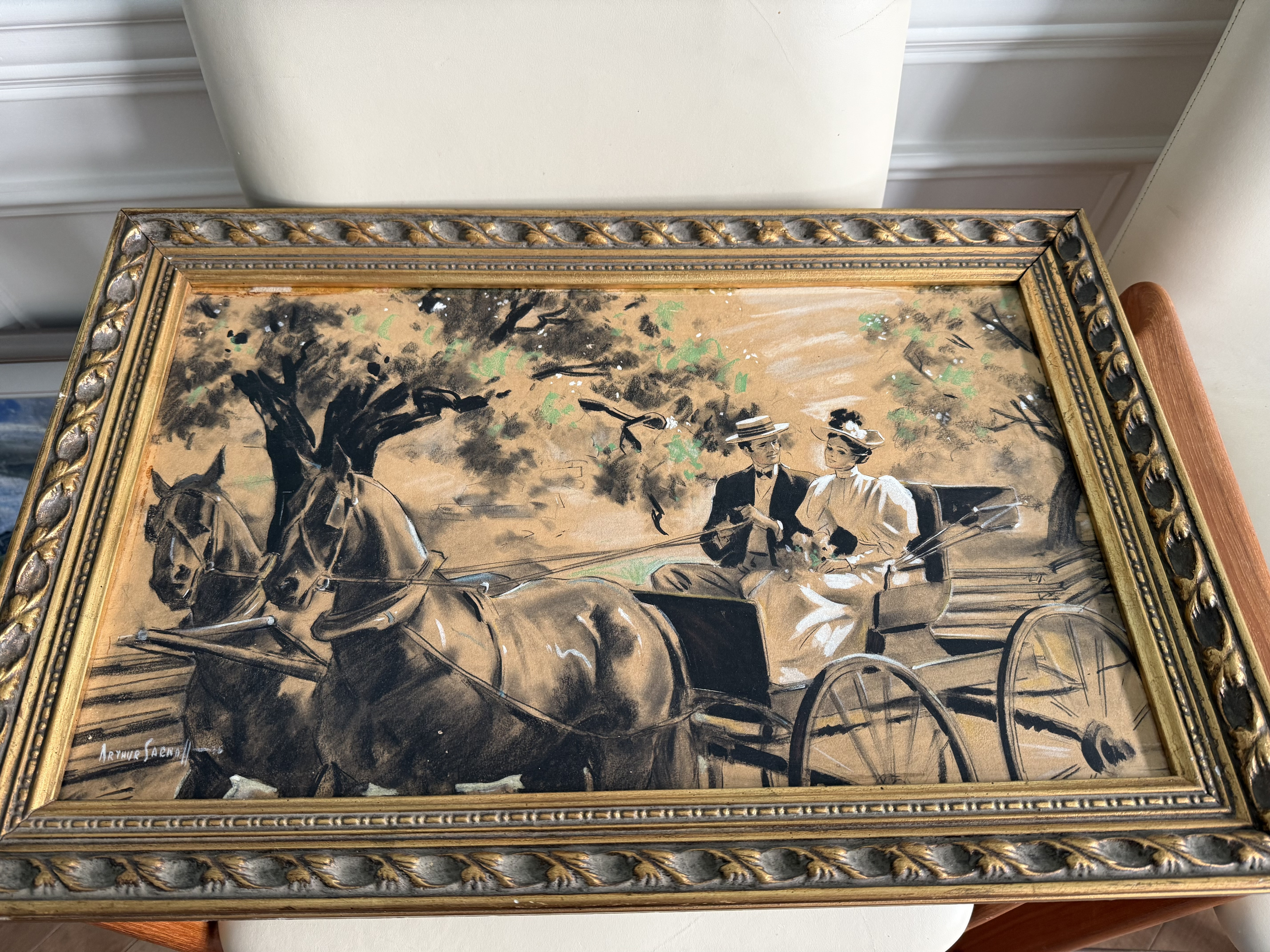 A couple riding in a horse-drawn carriage done by Arthur Sarnoff before he was well-known. Signature is different than later signatures