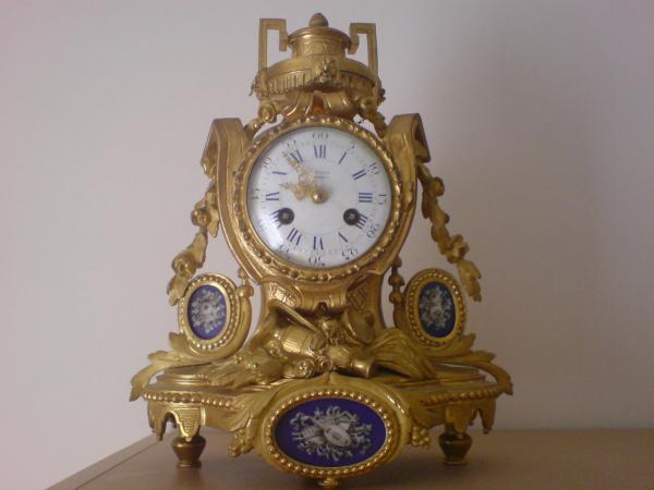 A fine ormolu mantle clock of English taste. The piece standing on turned feet under bow fronted shaped plinth. In turn with beading. The centre housing oval panel enclosing blue and white ceramic plaque depicting "The Arts" The balloon form of the clock with claret jug on its side to lower centre bordered by foliate swags and arch. The bezel of the clock surrounded by beading and enclosing a white enamel dial with roman and arabic chapters. Two winding holes 4" ande 8"