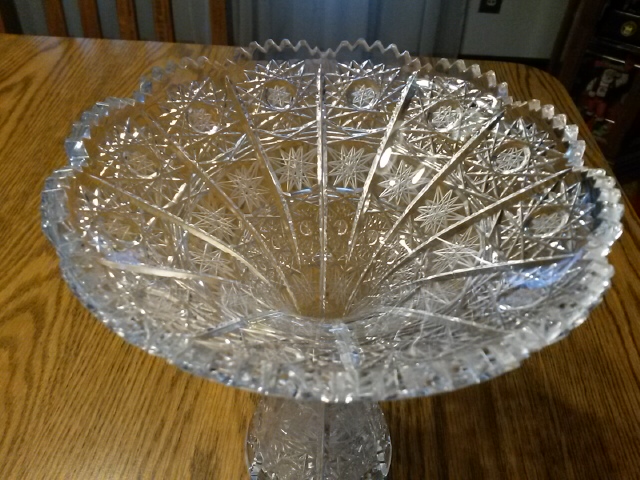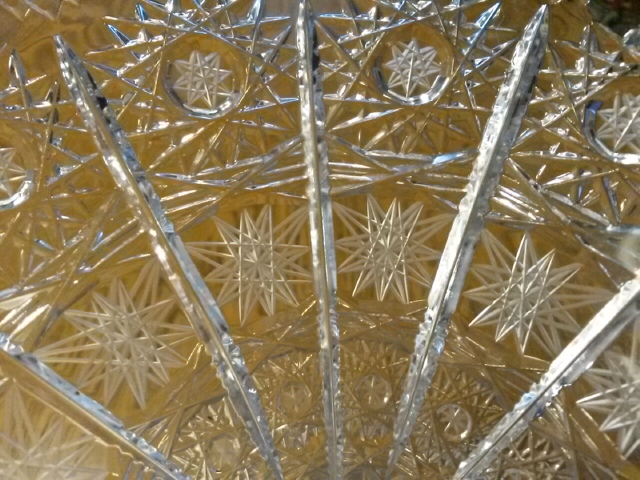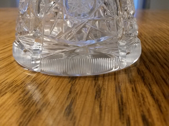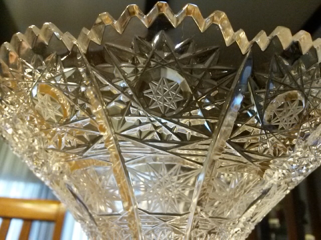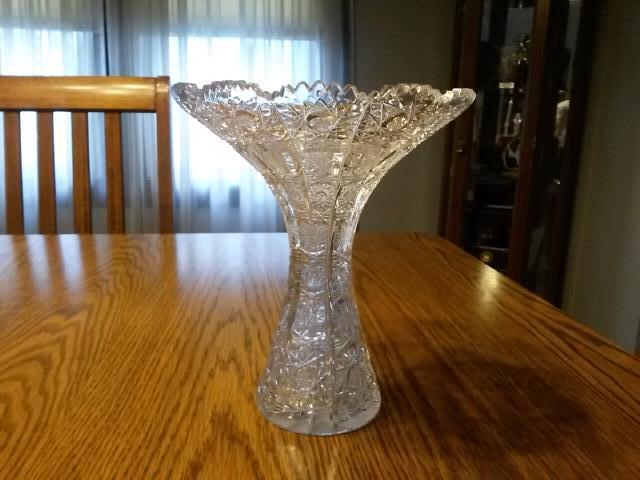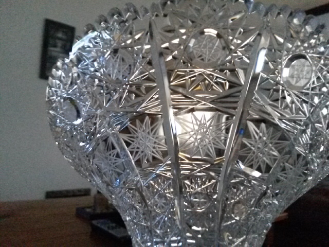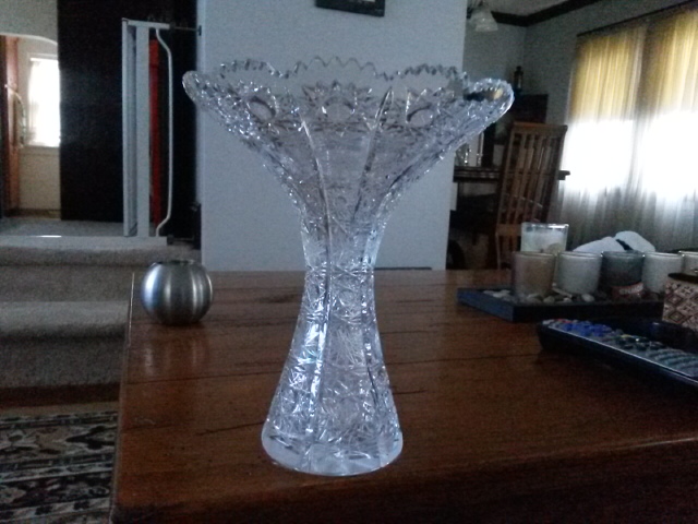 Flared crystal vase has star pattern all over. Two different styles of stars cover the entire surface. The rim is scalloped the base has line detail around the base and a large star on the bottom. Looks like american brilliant but has no mark so age is unknown. Star pattern feels sharp/rough rather than smooth. Any information I could get would be wonderful. I'm interesting in knowing maker, age, does it have value, etc...