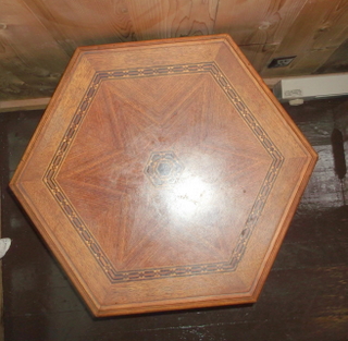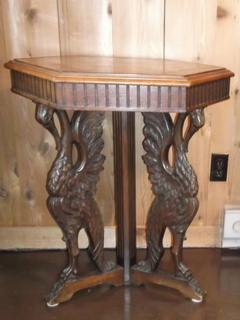 This is an all wood end table supported by three ornately carved swans. The top is six sided with a geometric pattern made from inlaid wood. There are no identifying marks. I'd like to know what the style is and who created it, as well as it's value.