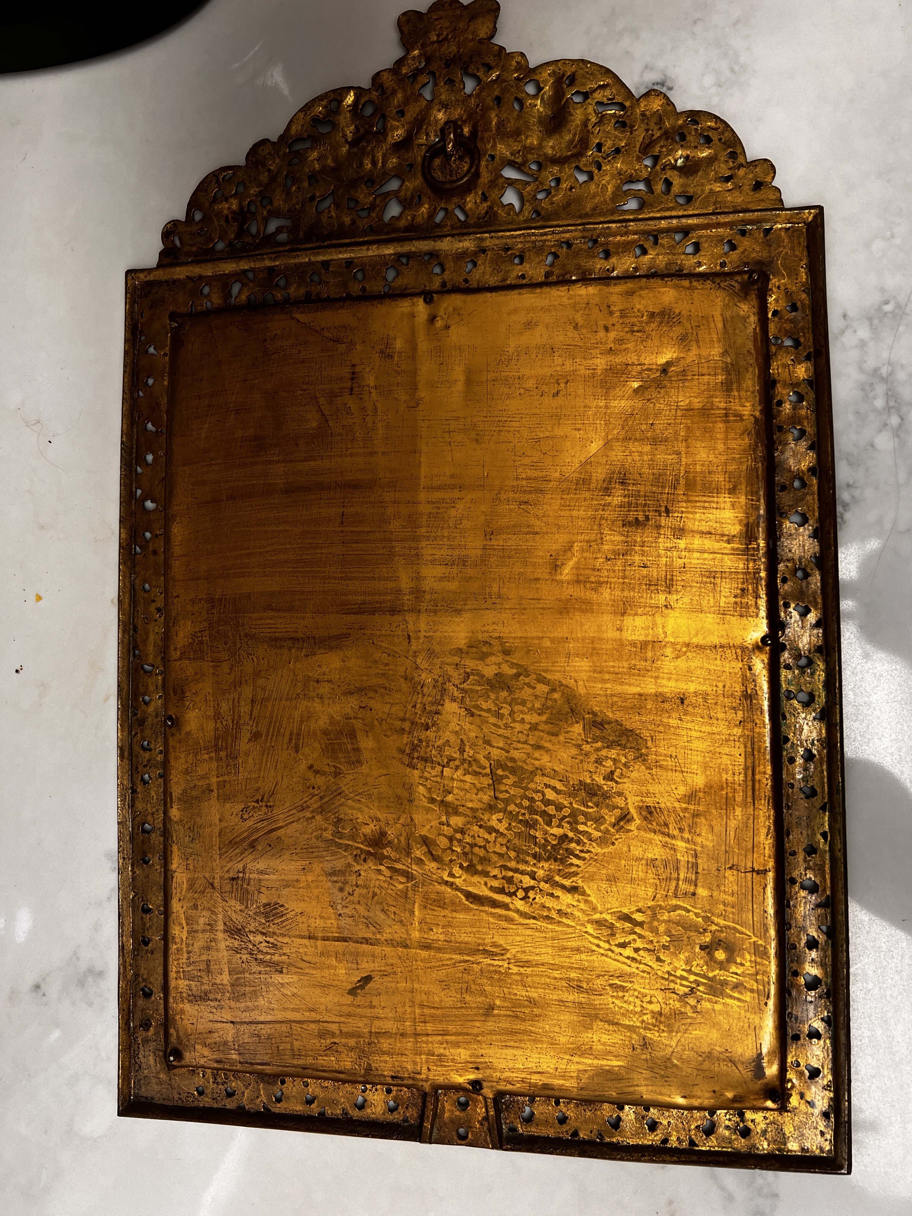 Physical Description: This exquisite mirror features a Hollywood Regency Italian style with intricate carvings and a gold gilded finish. The overall dimensions are approximately 12.5 x 20 inches, and it weighs around 9 lbs. The frame is made of metal with a beveled mirror surface, showcasing a highly ornamental design.
