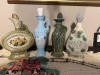 Two 13" high porcelain decanters with two bucolic scenes on each one and raised flowers and vines.