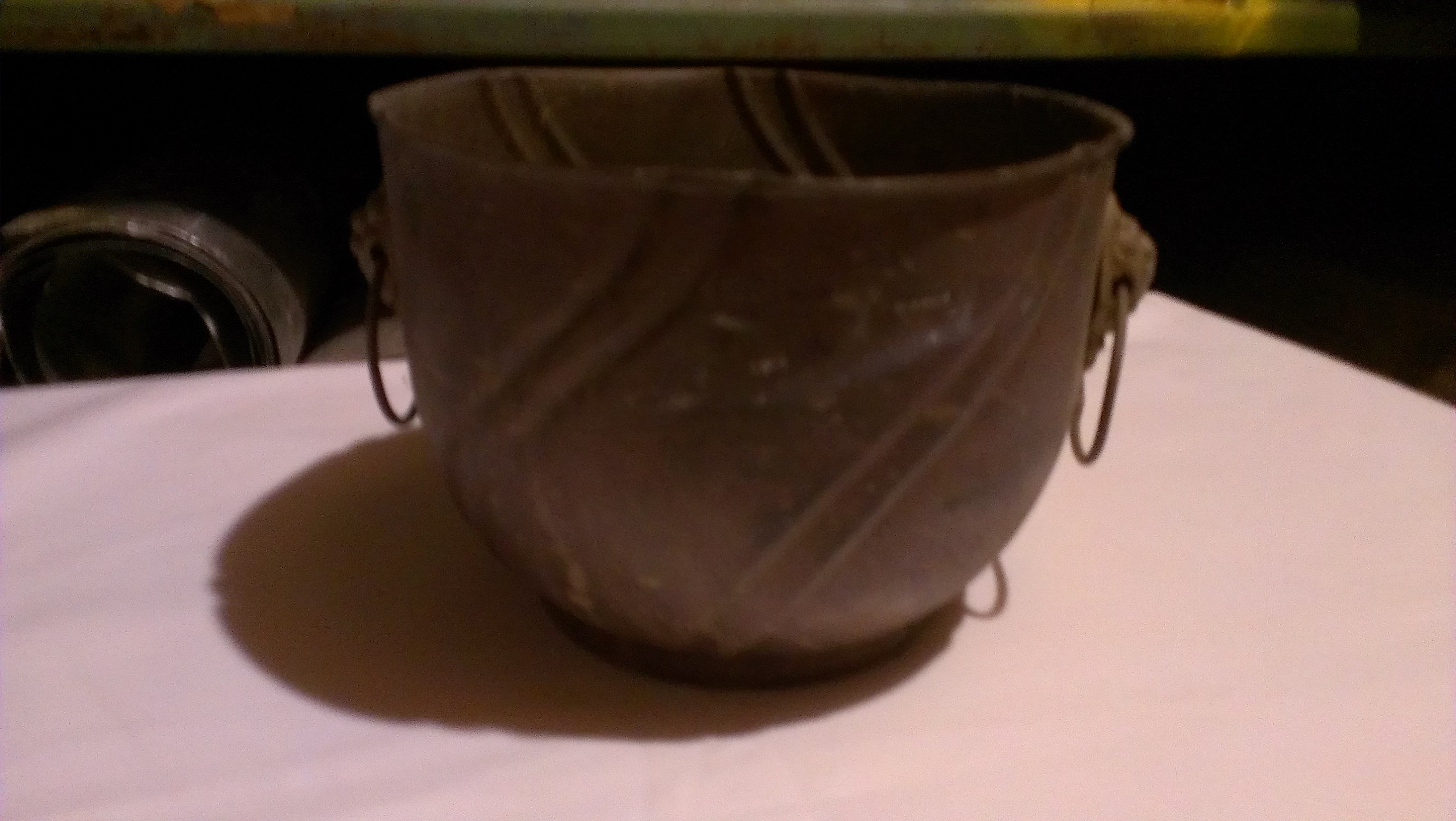 This is a seemingly old brass bowl, possibly intended for fruit or other items to be used as a centerpiece. It has stylized contour lines in a twin patttern lightly spiraled around the bowl. The brass castings holding the ring-style handles are formed as small bunches of grapes.