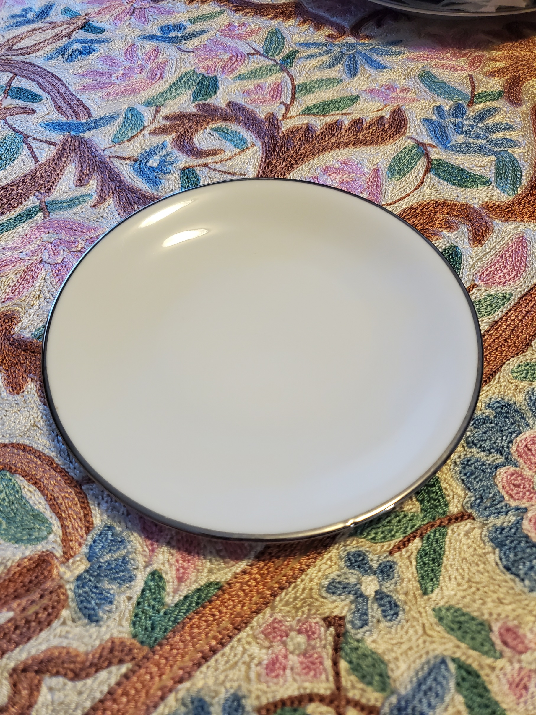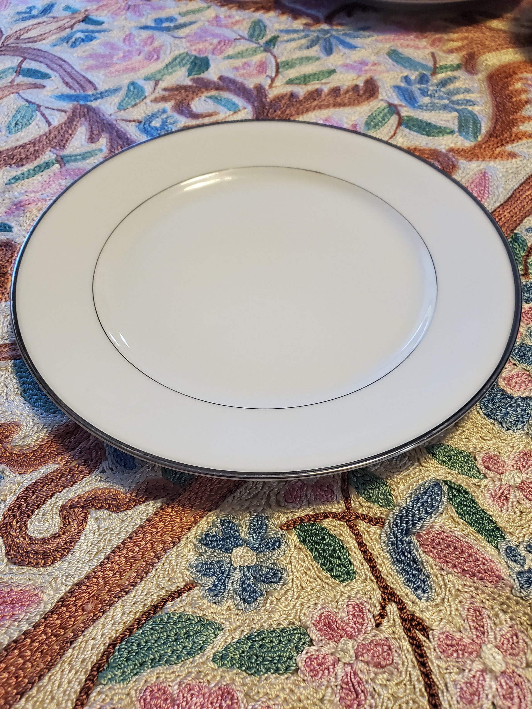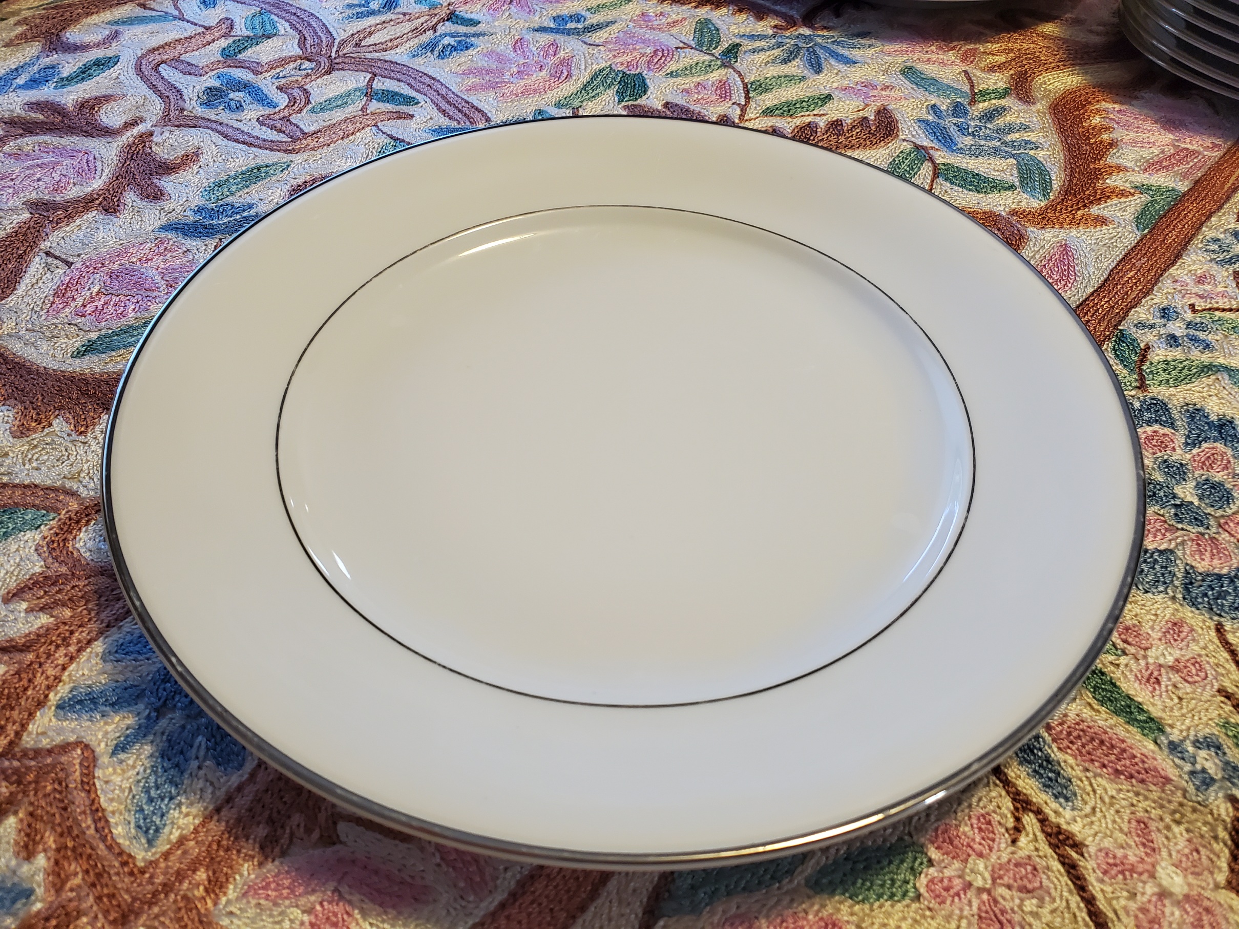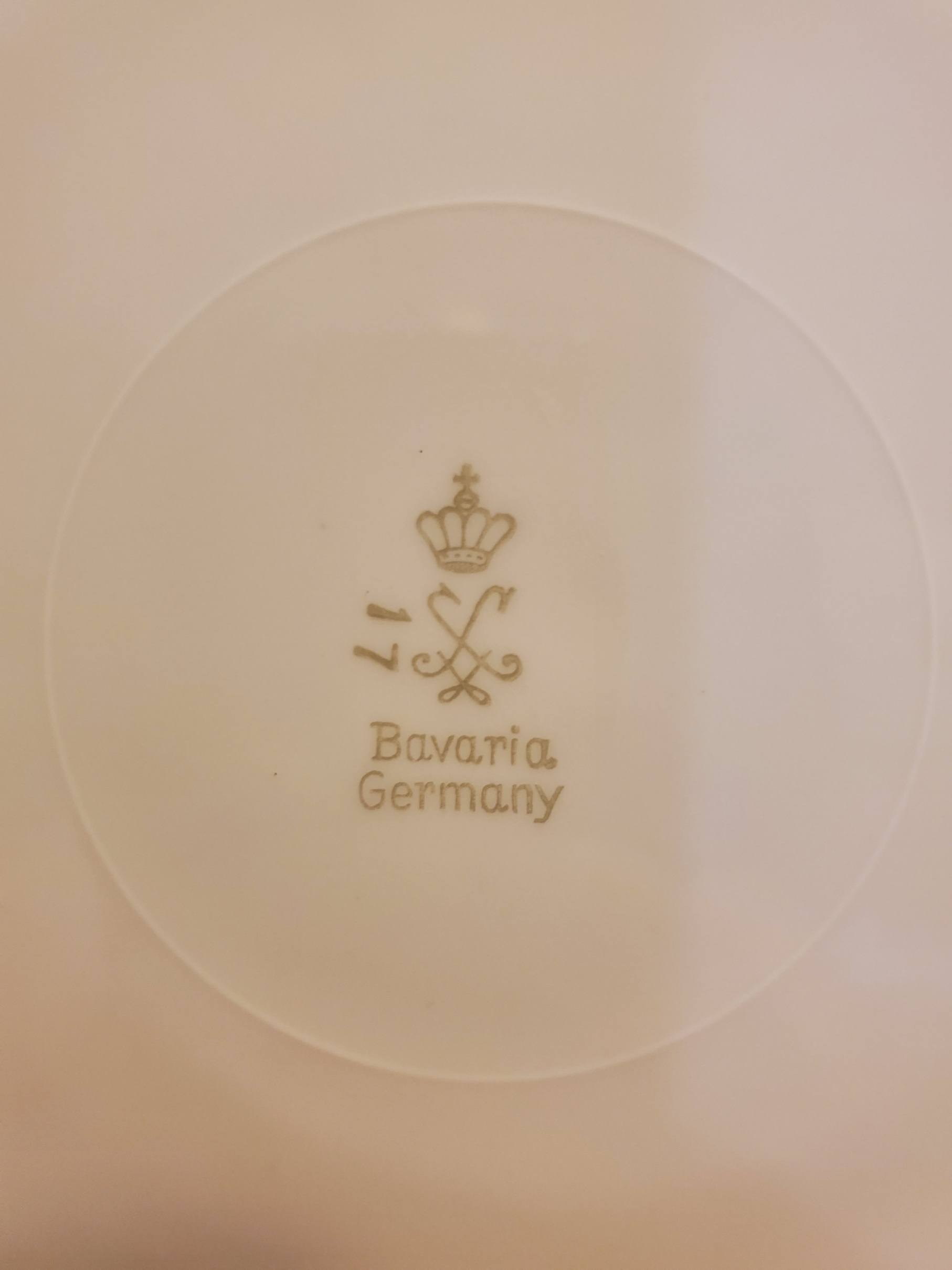 Oscar Schaller and Company porcelain china set, originally 12 place settings but missing a few pieces that broke over the years. Simple and elegant silver edge decoration. Available information online about the crowned "S&C" and "Bavaria, Germany" markings date this set circa 1918-1935. I am able to place the date more specifically around 1932 because that was the year my grandparents were married and originally acquired this set. I'm interested in getting an accurate value appraisal, and I might consider selling the set but I haven't decided yet.