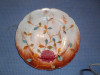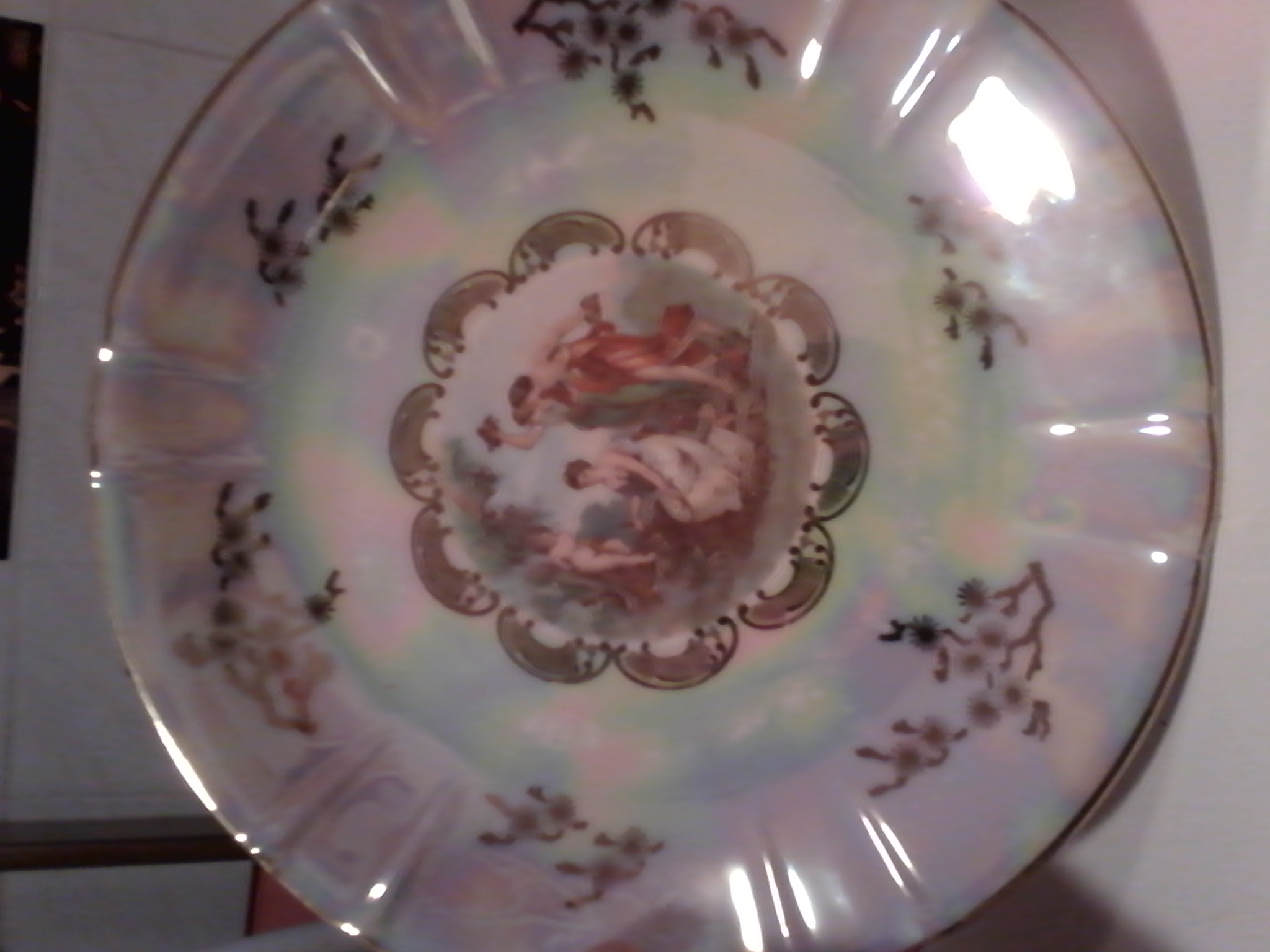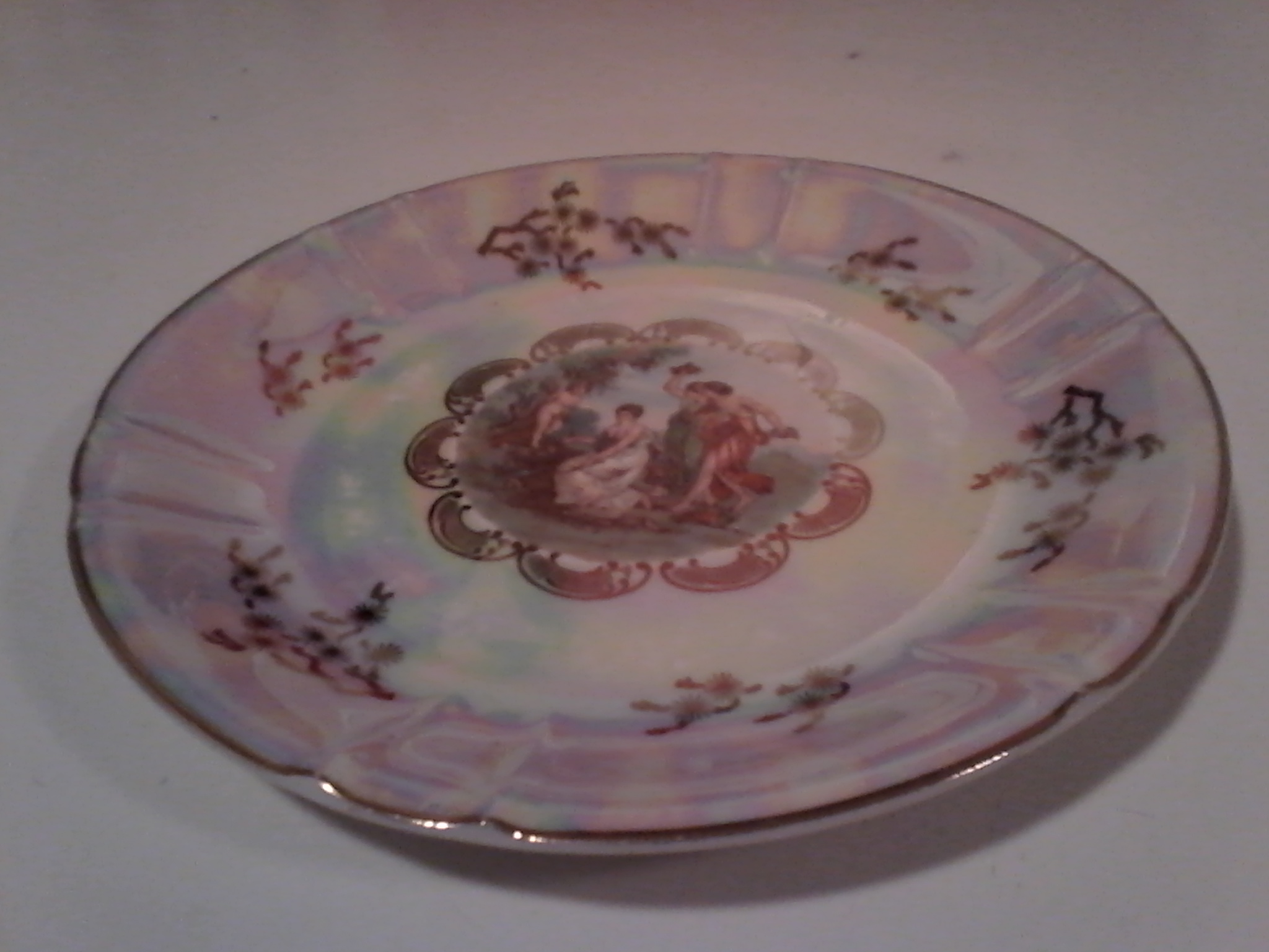 It looks to me like a dessert plate...beautiful colours that are changing depending on the angle of view...golden coloured rim and small flowers around the central picture.
