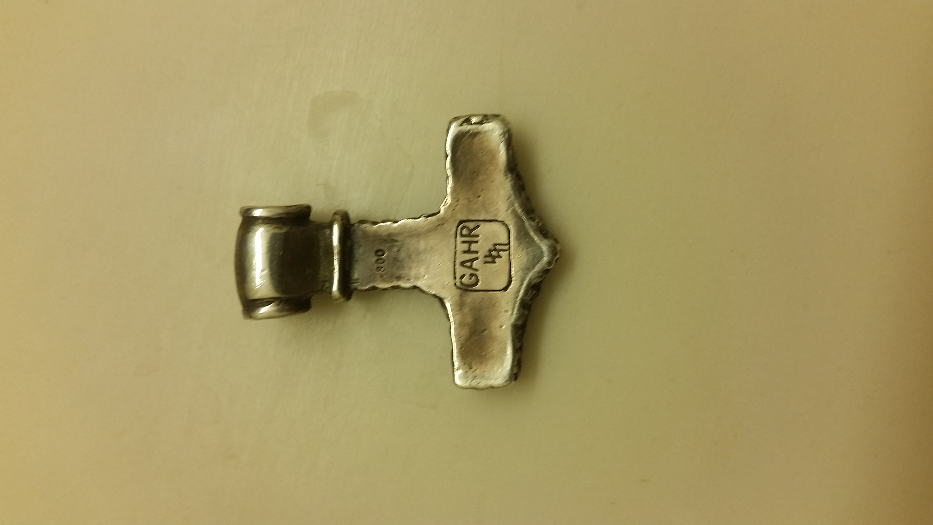 This was given to me by my grandfather who brought it home from Munich at the end of WW2. It is a Gahr Co. made Thor's Hammer. It is solid silver, .800 with GAHR on reverse