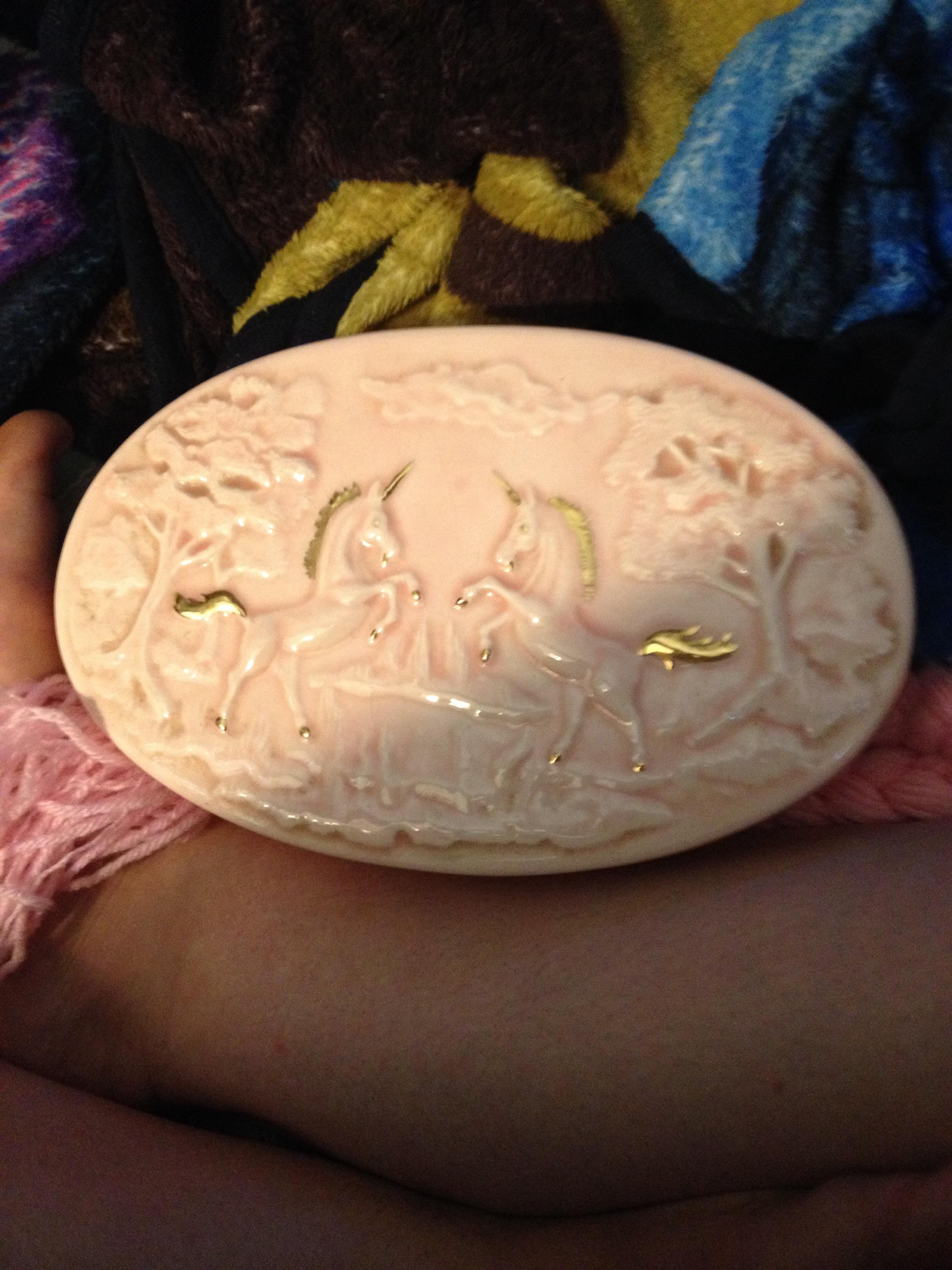 We got this at an estate sale. It's light pink with unicorns. Their manes, tails and hooves are gold. There are no markings and there are unicorns, trees and clouds on the sides.