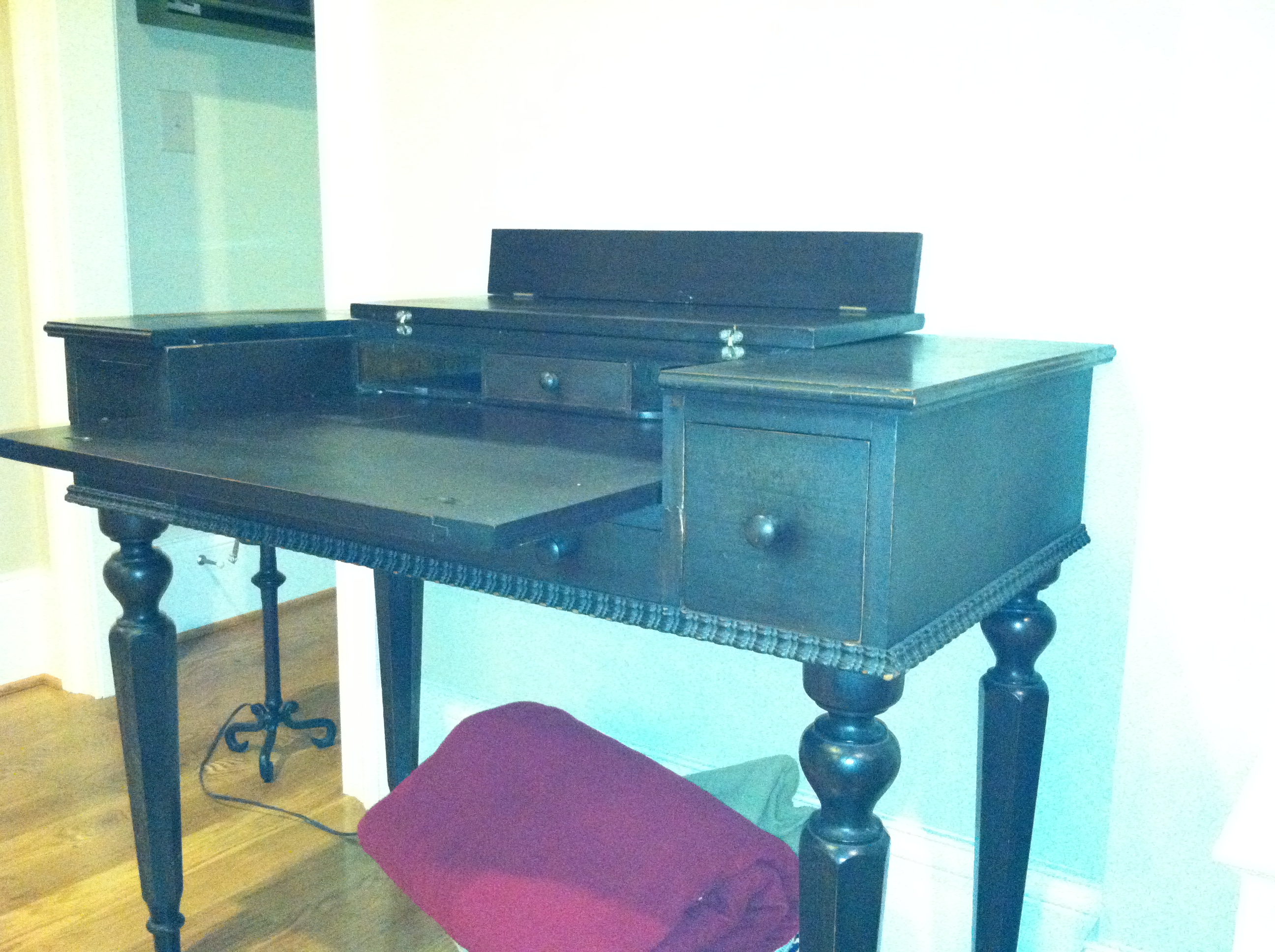 Good condition, minor scratches, sturdy. Dark wood, possibly oak. Top section of table lifts up and back to reveal a desk area. Bottom portion of antique table pulls out to increase desk area and there are sections inside the table that resemble a secretary. I'm not sure what this piece is called. Someone once told me it was a "piano table". I purchased it about 15 years ago in an antique store. There is a metal plate on the inside of the long center drawer that is stamped with "Rich-Tex Home Furnishings" "O.W. Richardson & Co. Chicago". I have no idea how old it is or what it is really.
