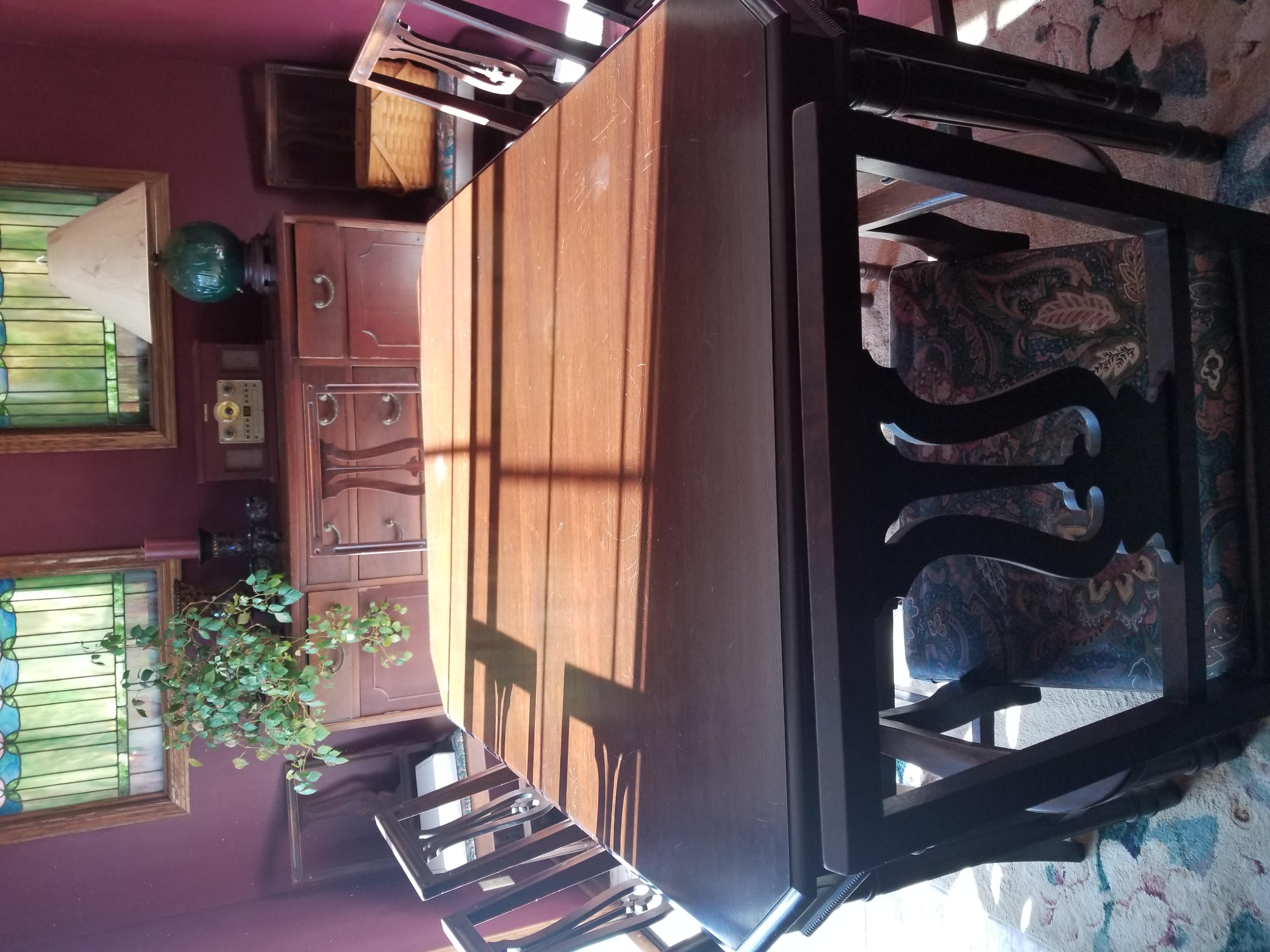 O.W. Richardson & Co., Buffet Size 62" W. 21" D. 39" H., Table Size 45" W. 59" L. 29-1/2" H. with 1 leaf, 2 captain chairs and 6 standard chairs. Good condition.