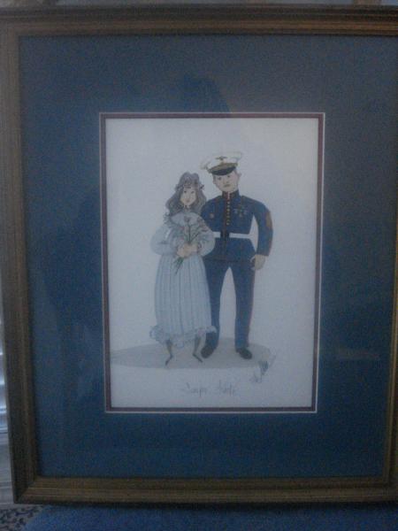Beautifully framed signed Lithograph of P. Buckley Moss "Semper Fidelis". Brush gold wood, triple matted, colonial blue on marine red on navy blue. Also referred to as Marine and His Bride. Rare and not available.
