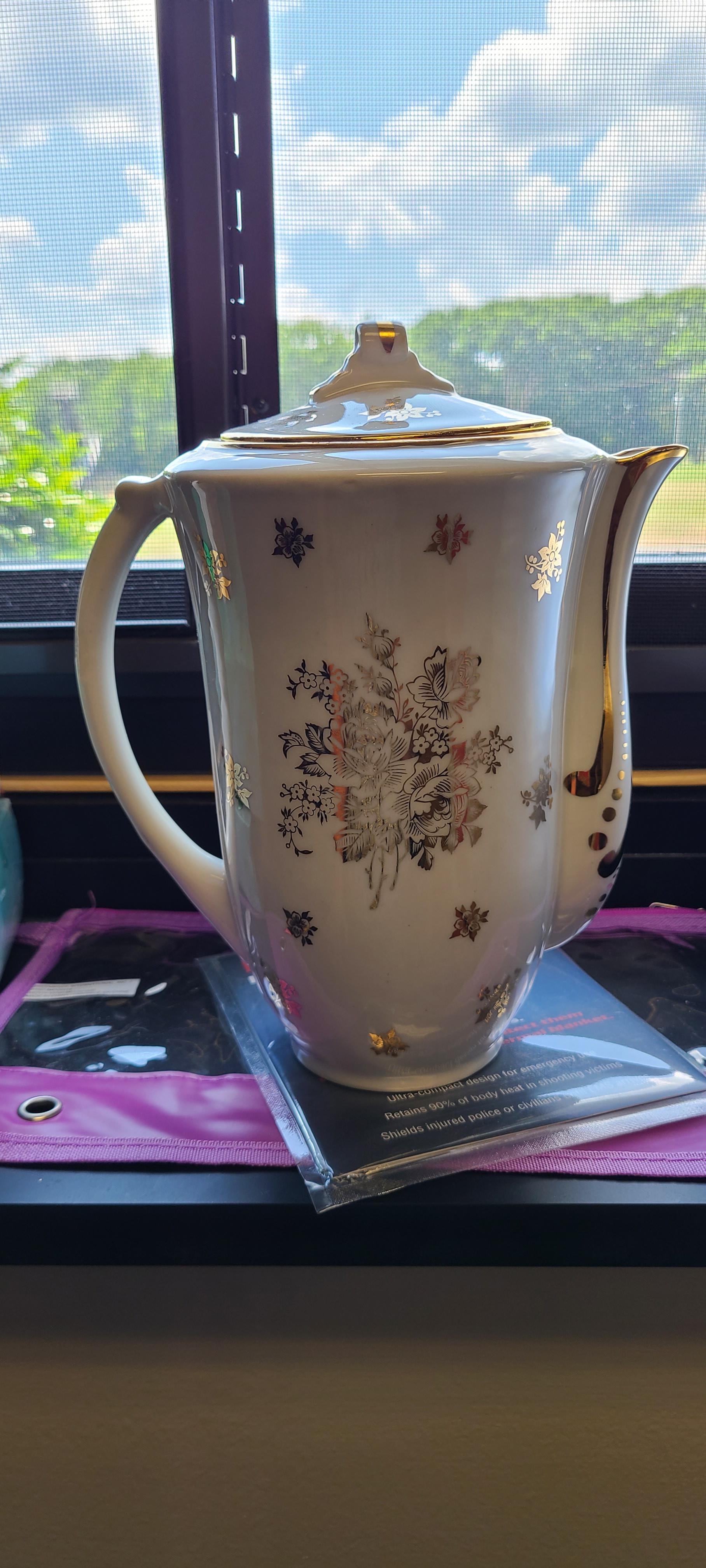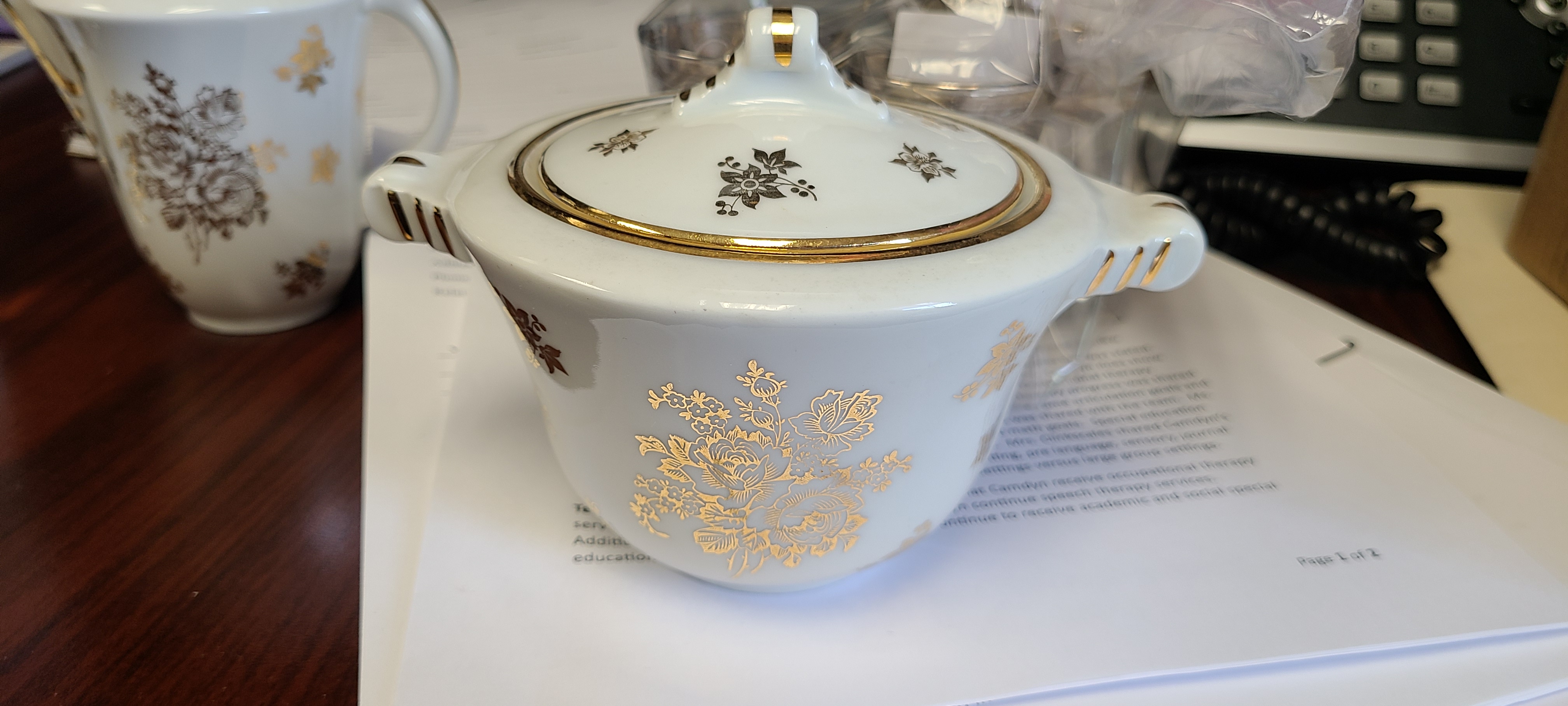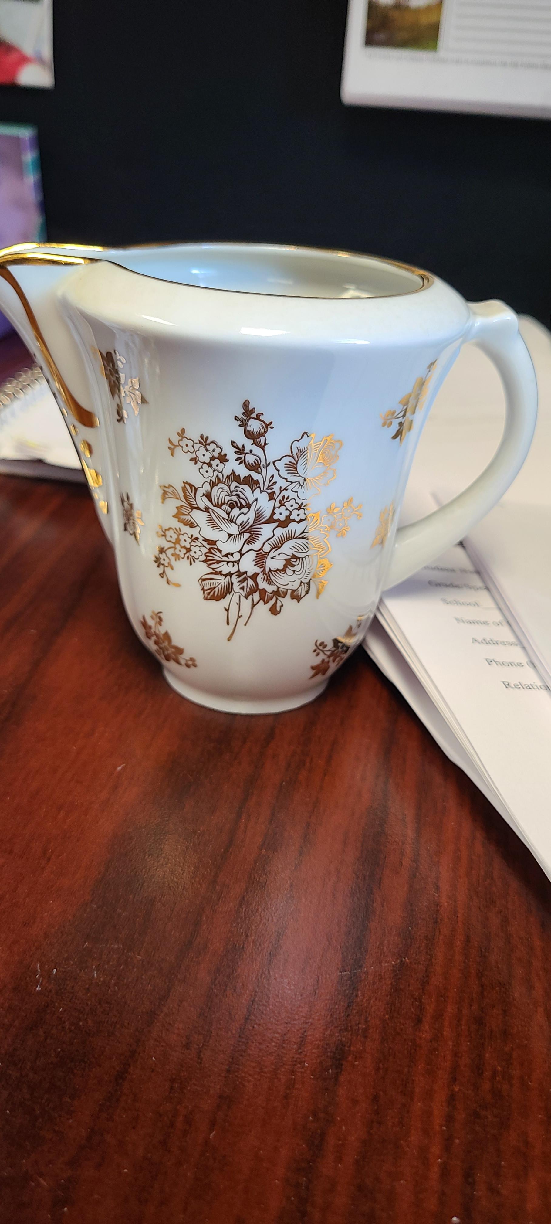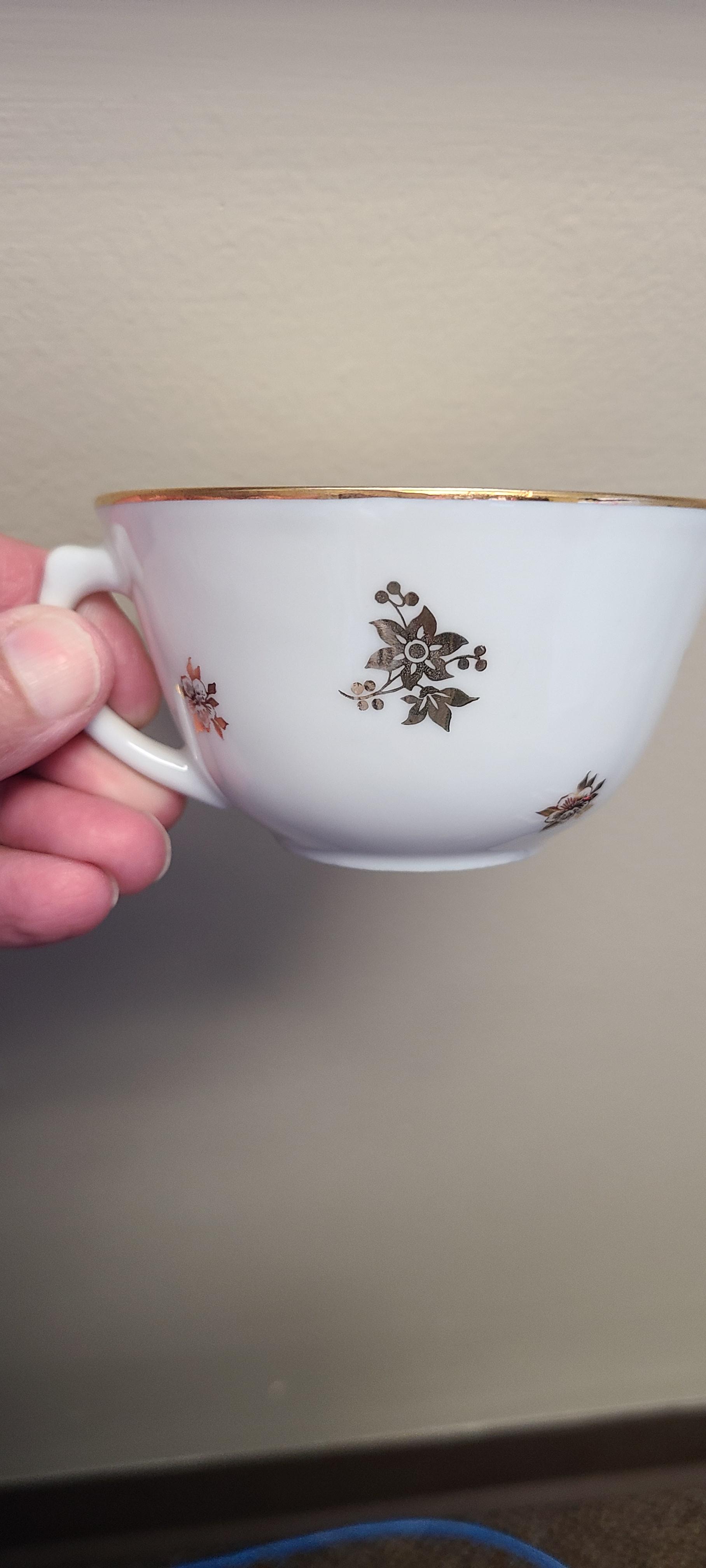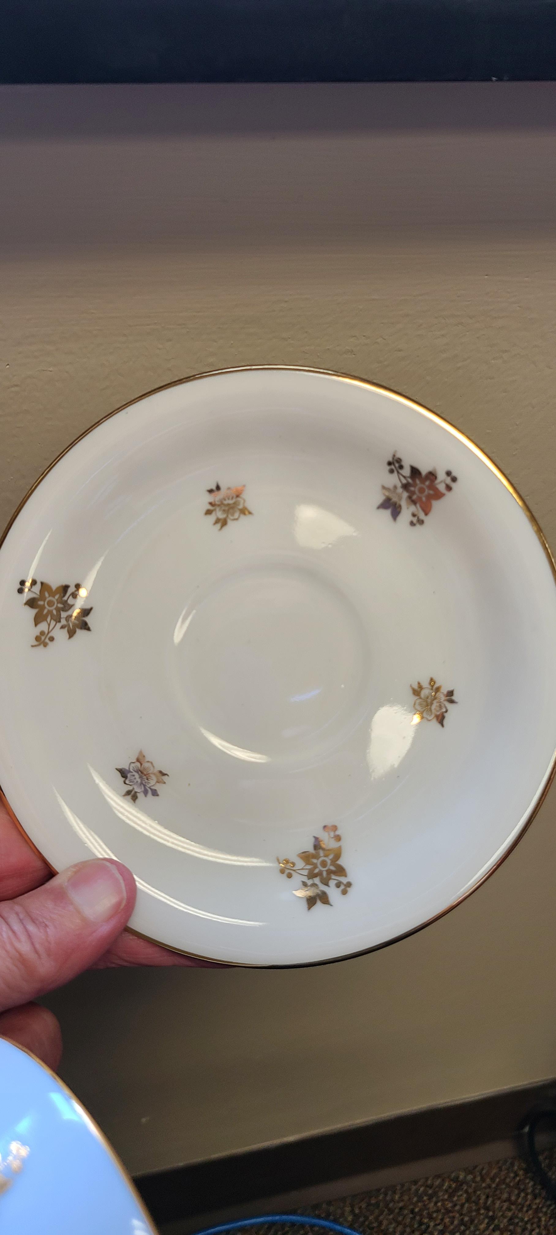 Teapot, sugar bowl, creamer, 8 cups and saucers all in good condition. All have gold flowers on them.  No other markings.  Stamp on the bottoms states: P. Pastaud, Limoges, (France)