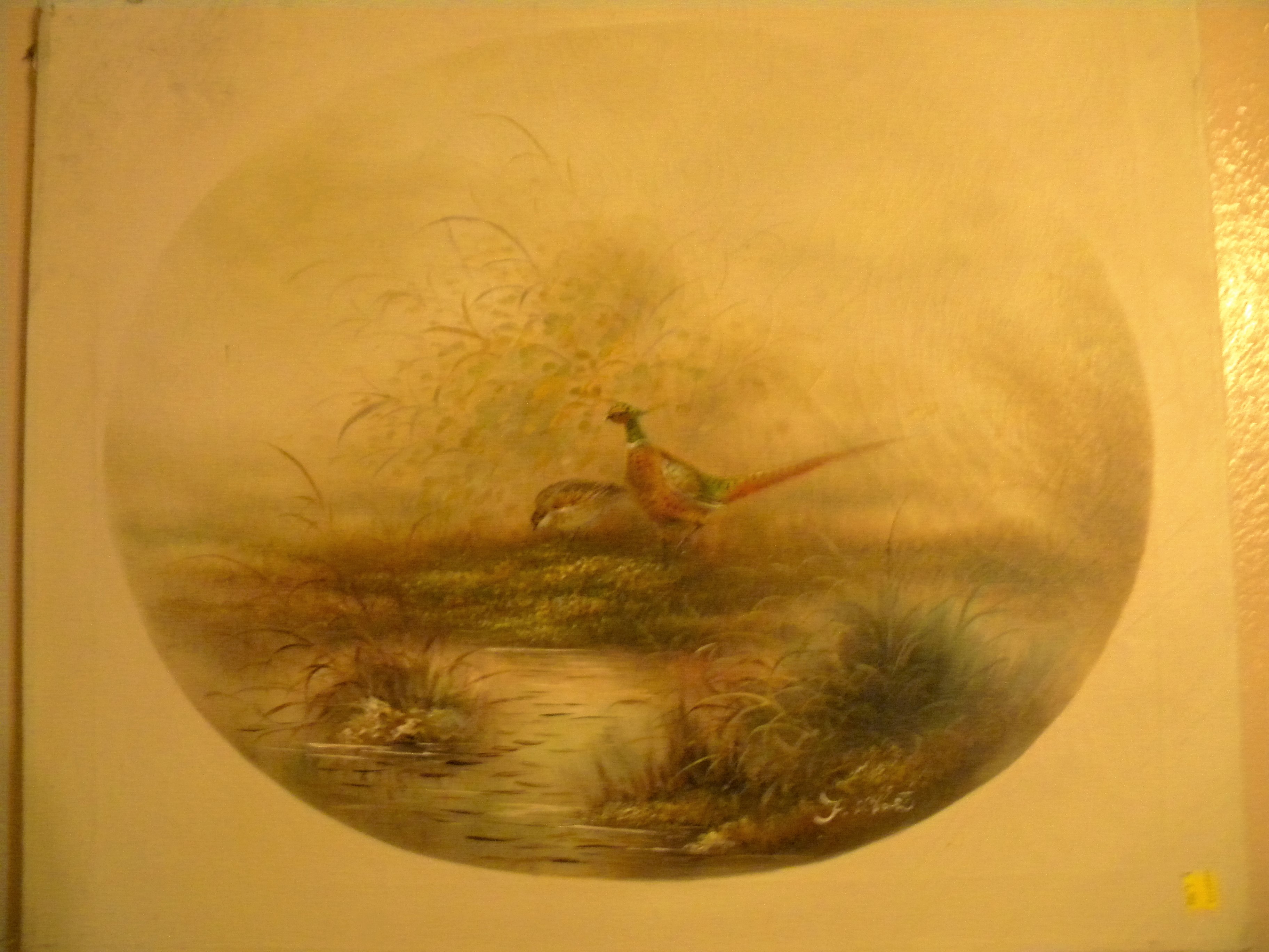 this is a painting of two pheasants in a marshy fog setting with reeds behind birds -- it is painted in oil on canvas in an oval centered on a 2ft by 3 ft white canvas - the name P White appears on the botom right -- is matches an Owl of his seen on line before - the canvas is damaged slightly in the uppeer left but this is not near the oval painting of the birds birds are centered in oval with water in front and reeds behind