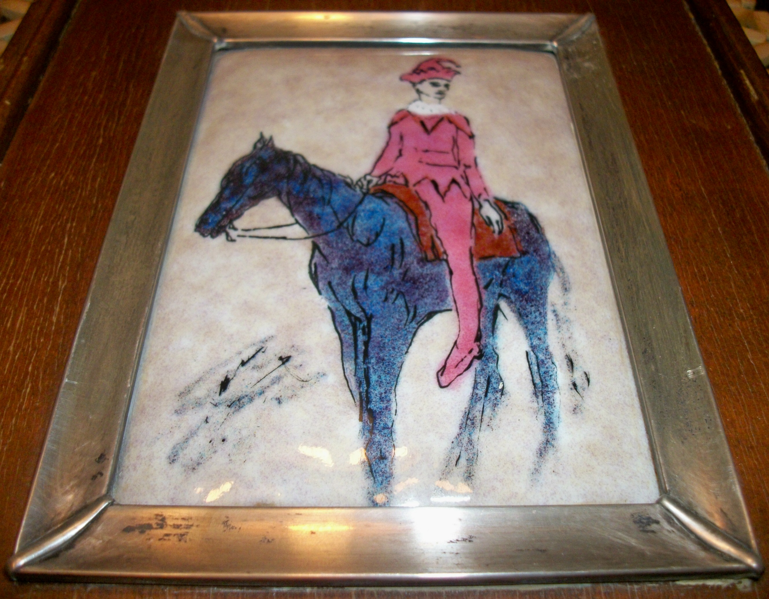 A 4 inch by 5 1/2 inch, enameled representation of Pablo Picasso' "Jester on a Horse" (1905).