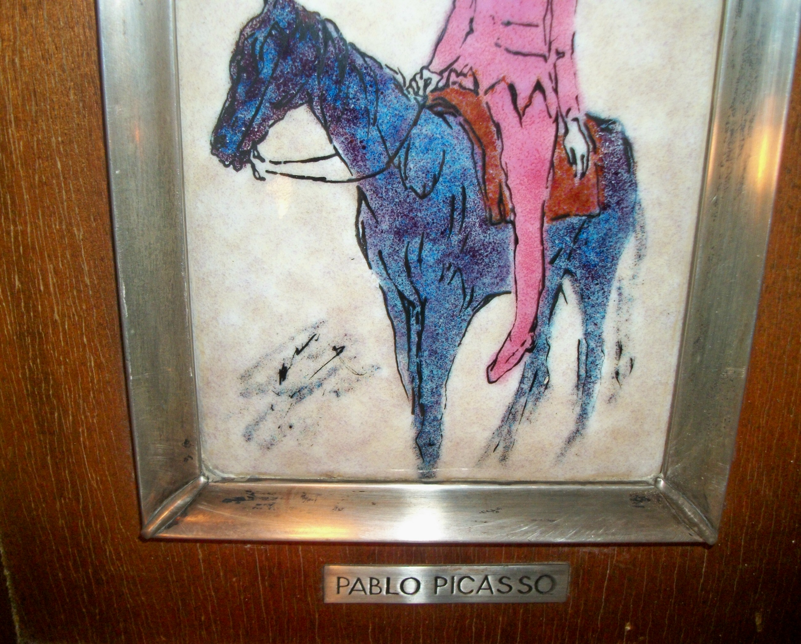 There is an engraved silver name plate under the picture with the words "Pablo Picasso".