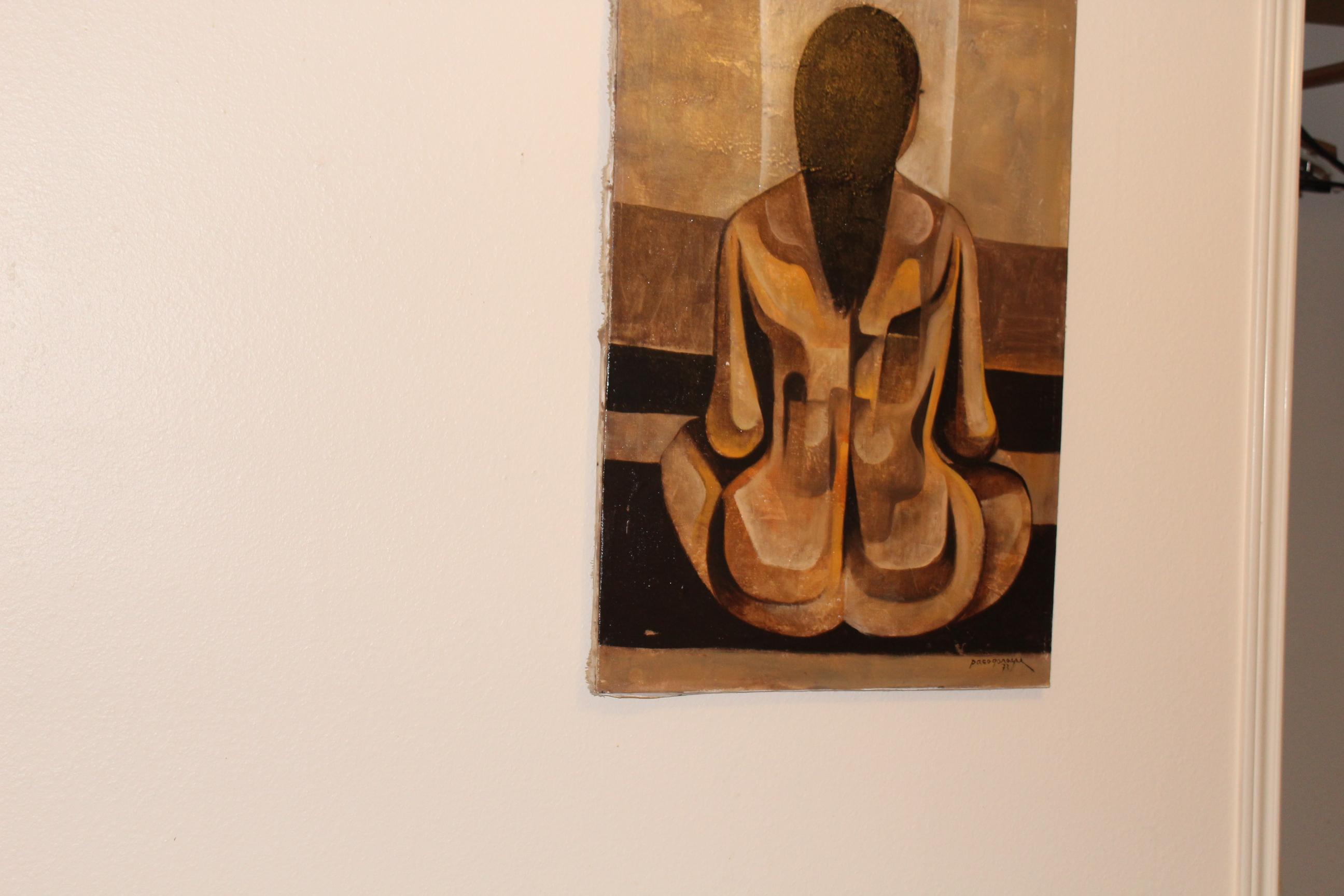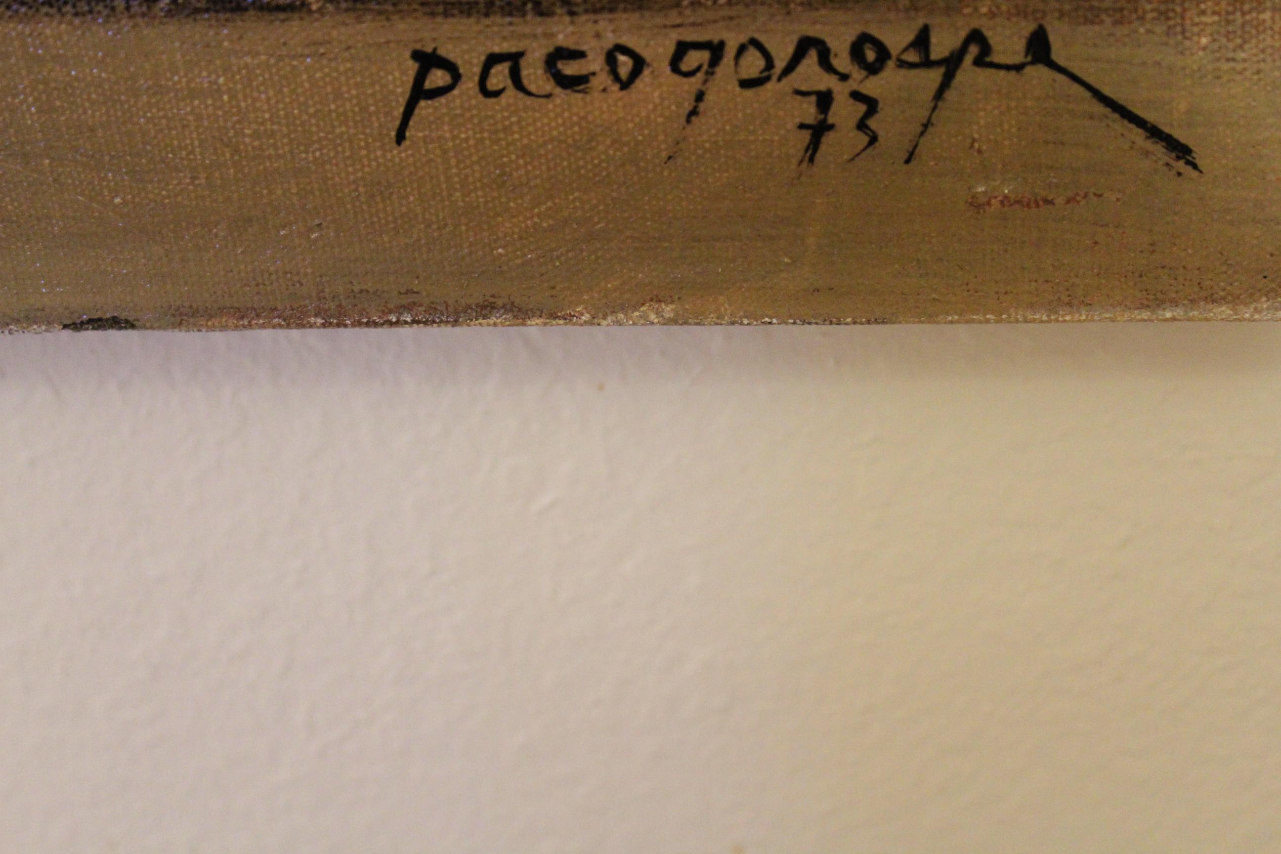 Oil on canvas, 24x32, brown and gold tones. Signed Paco Gorospe 1973