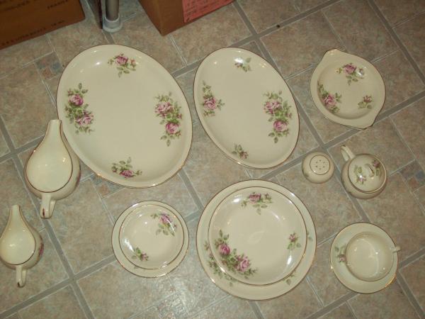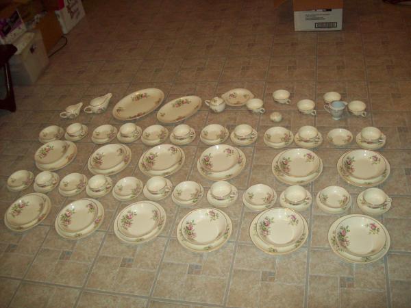 I found the whole set in my dad's house while I was cleaning after he passed away. there are 12 place settings with 5 pieces per setting ( plate, salad bowl, fruit bowl, cup, saucer, and bread/butter plate.. I also have a 15 in and 13 in oval serving platter, a lg and small gravy boat, sugar pourer w/lid, one under plate, and 5 extra cups, and a salt shaker.