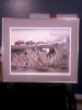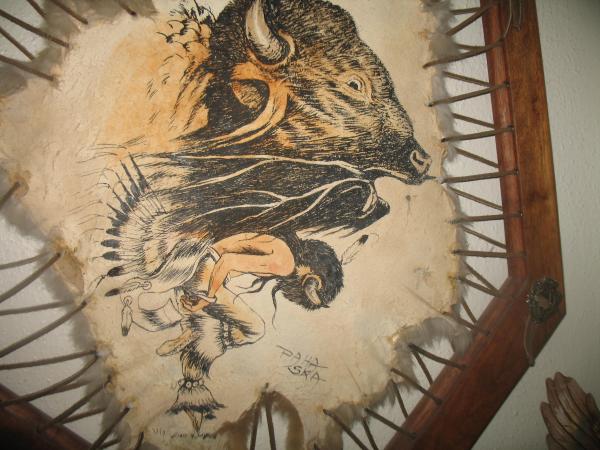 signed Paha Ska, painting of a buffelo and native american dancing, painting done in black with a bit of orange/tan coloring on the burrelo and dancer