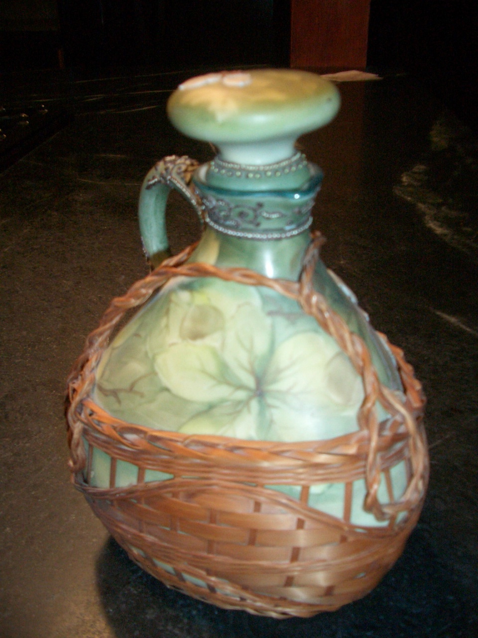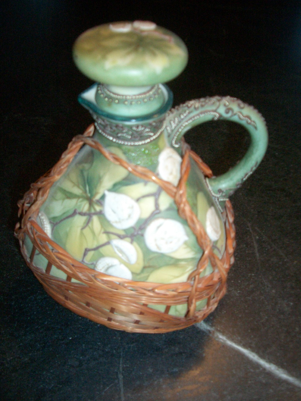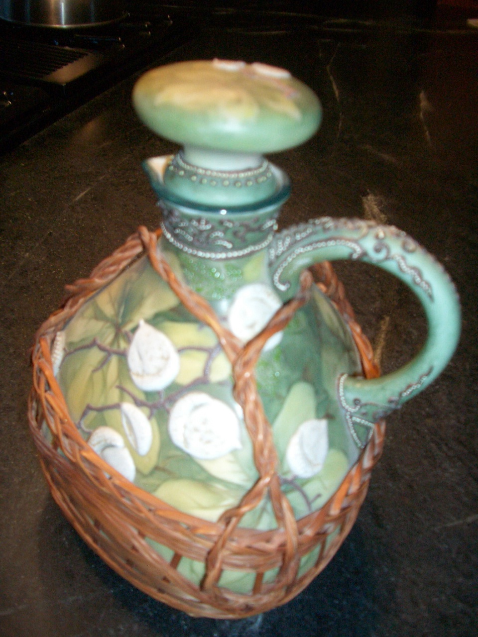 An 8" tall, 6" wide primarily green pitcher with a basket base in perfect condition. The design is handpainted flowers with stems and acorns in raised relief. There is a raised "dot" pattern on the handle and around the spout. Under the lid is an attached cork. There are no markings or name on the bottom. It belonged to my grandmother, but I do not know where she got it, or how long she had it before she died. It has been in our family for at least 80-90 years.