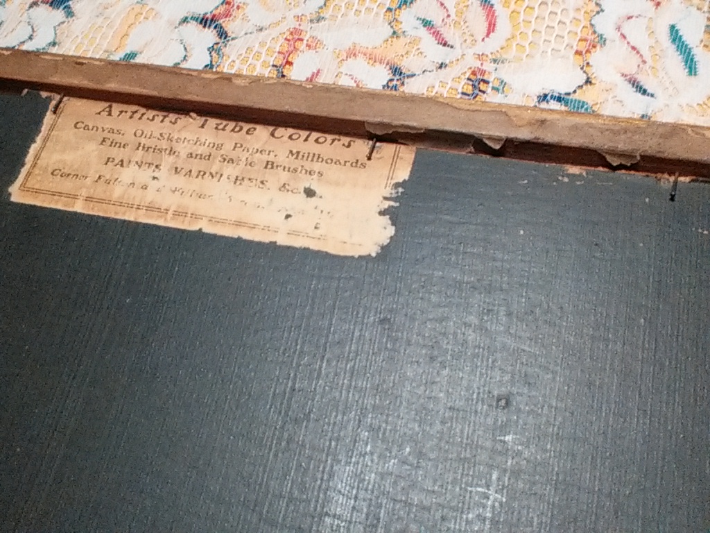 I think the back (shown) says "Artists Tube Colors". Canvas Oil Sketching Paper, Millboards, Fine Bristel and Sable Brushes. Paints varnishes Ect. Corner Ful (can't make out the rest.)