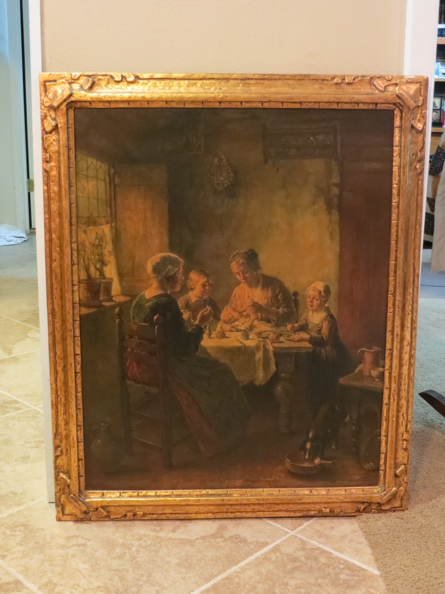I inherited this from my great-aunt from Michigan.   I'm not sure if it is an oil painting as it is very smooth to the touch.  It looks like it but it is done on wood so I'm not sure about it.  I've never seen painting on a wood slat.  I found a very similar piece on the internet several years ago, but in that painting there was a man in the doorway to the right(when facing painting). Any knowledge would be greatly appreciated.  The painting w/o frame is 24"x30"