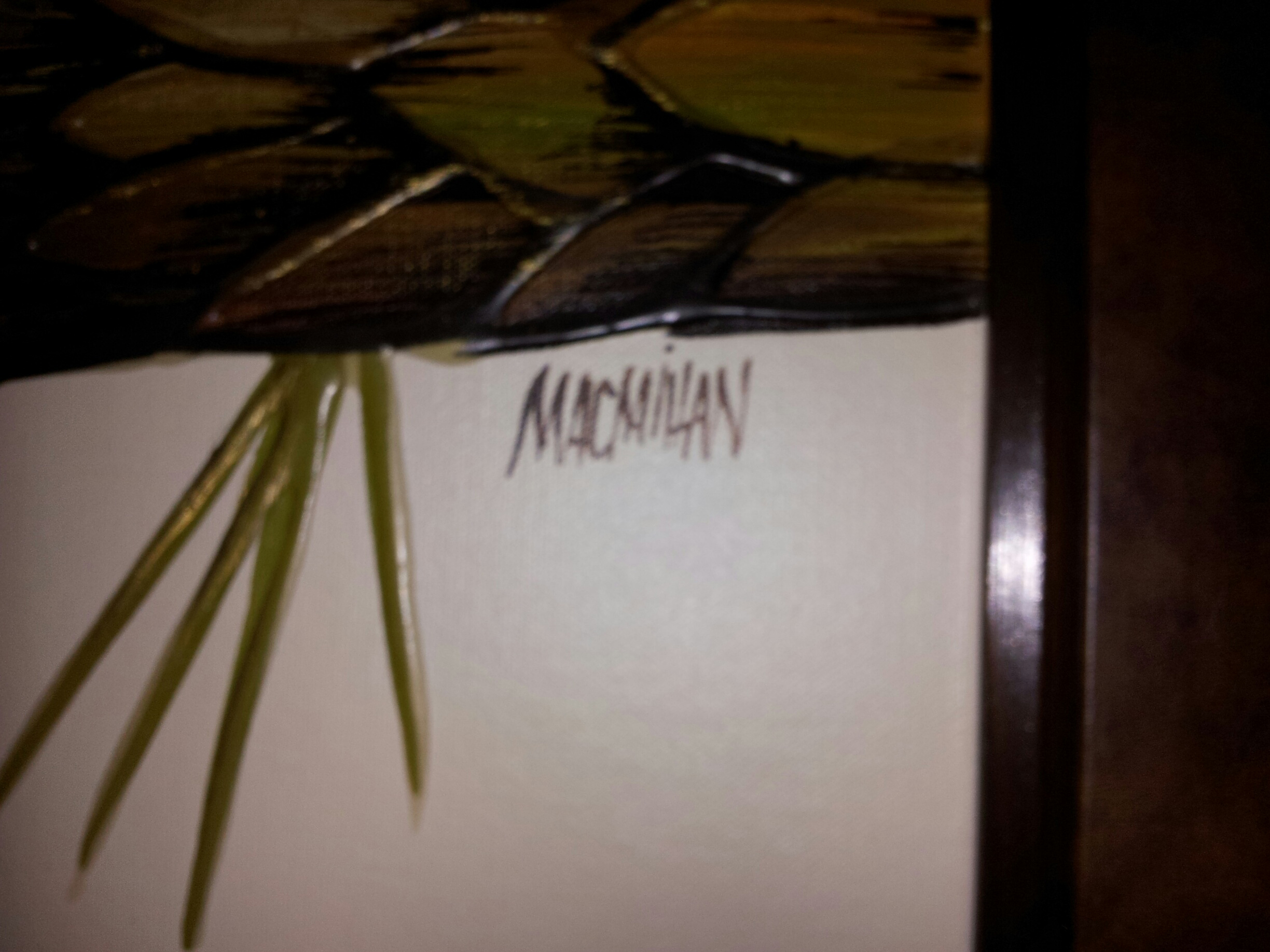 This painting is 42" x 42" not including the frame.  It is signed, all in capital letters, "MACMILLAN" just under the branch on the left side (right side of the photo).  It is painted on canvas and is either oil paints or acrylics.  The frame itself is either a leather or vinyl covered material, with a metal inset and metal pins or tacks on each corner.  The frame is very sturdy and well made.