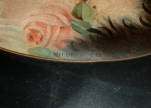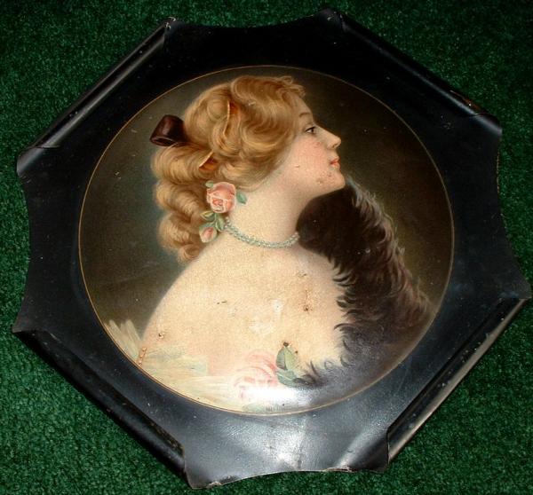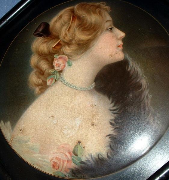 This appears to be a painting on metal with curled corners. Shows crazing and some rust pock marks. Very pretty girl maybe Gibson Girl.