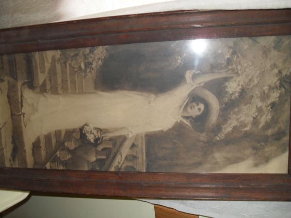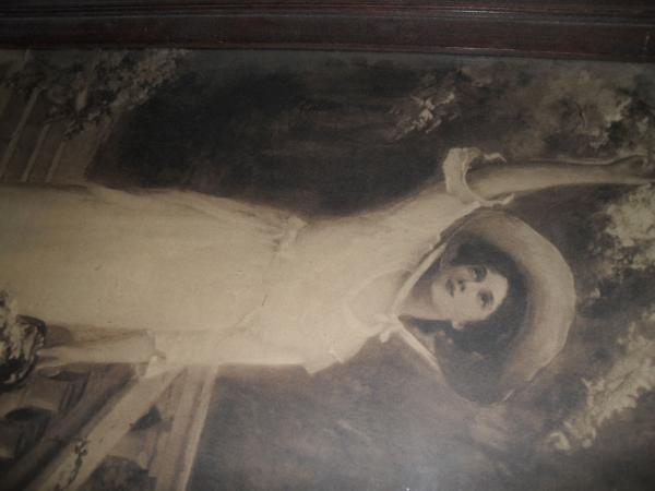 This portrait is named "Blossoms" notes on the bottom left have corner of the print/painting. In the lower right hand corner it is labled J.LAUSTEN & Co just above it there is writing but is blackened out appears to be _RYS_ _ _