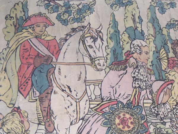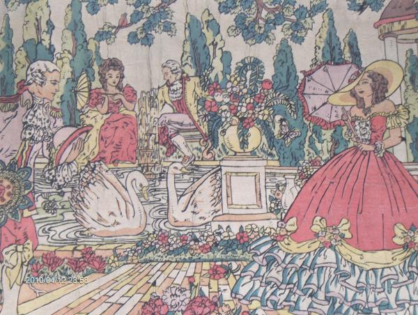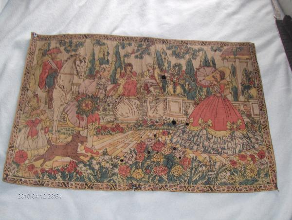 Description Tuis is a very colorful tapastry..not sure if its victorian or southern.It reminds me of abraham lincoln days just by the way they are dressed.On the left side is a young man on a white horse,a little girl holding a doll,a brown dog and a gentleman standing like he came to court the young woman on the right side of painting.There is a man and woman sitting at the top center and below them 2 swans in a pond.On right side is a woman holding an umbrella,a gazebo in top right corner.Lots of flowers and trees.In bottom left corner it has S.Jacobs (c).On right hand corner it has B.Thomas.I would like to find out more so i can put a fair price on it to sell.