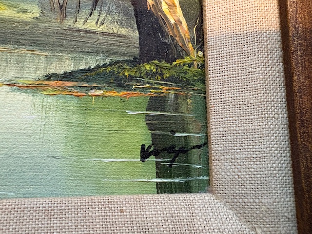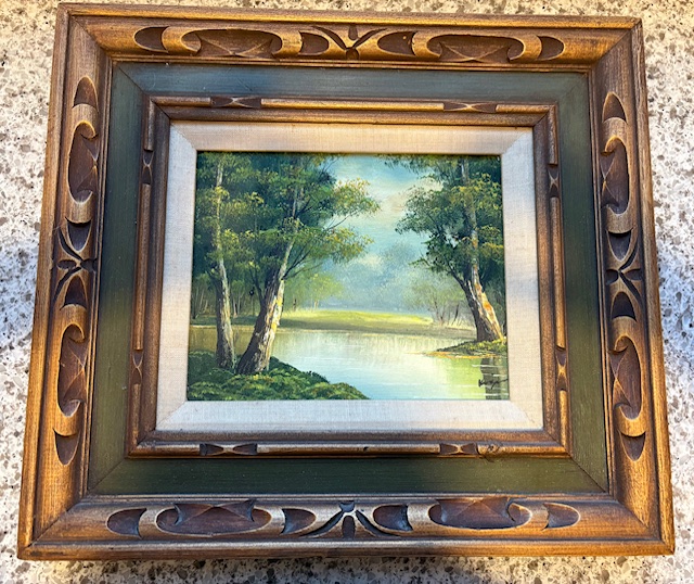 Physical Description: This painting features a serene landscape depicting trees and grass on both sides of a pond. The dimensions are approximately 9.5 inches by 8.75 inches. It is framed in a gold frame, which adds an elegant touch to the artwork. The painting is signed by the artist in the lower right corner, though the signature is somewhat difficult to read.